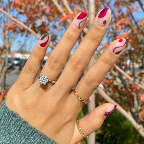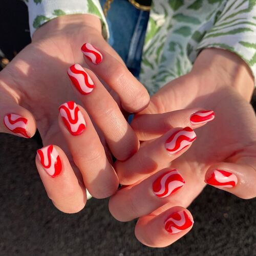 Классический вишнёво-красный цвет получил супер классный облик с помощью волнистого дизайна ногтей и пастельно-розового цвета. Эти ногти обязательно украсят любой наряд.
