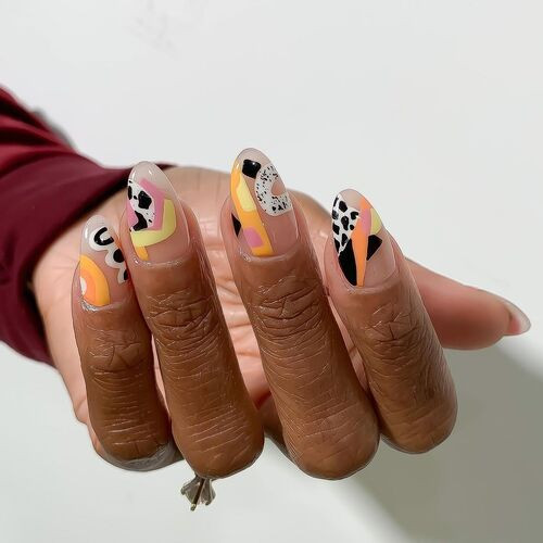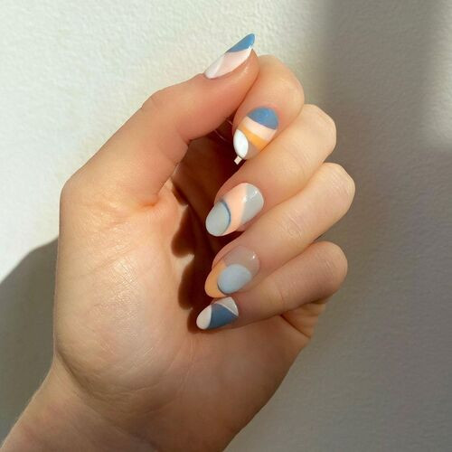 Если абстрактные ногти кажутся неправильными или некрасивыми, то мягкая нейтрально-розовая основа делает эти цвета яркими и праздничными.
