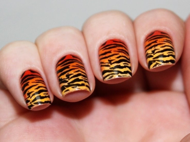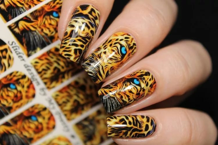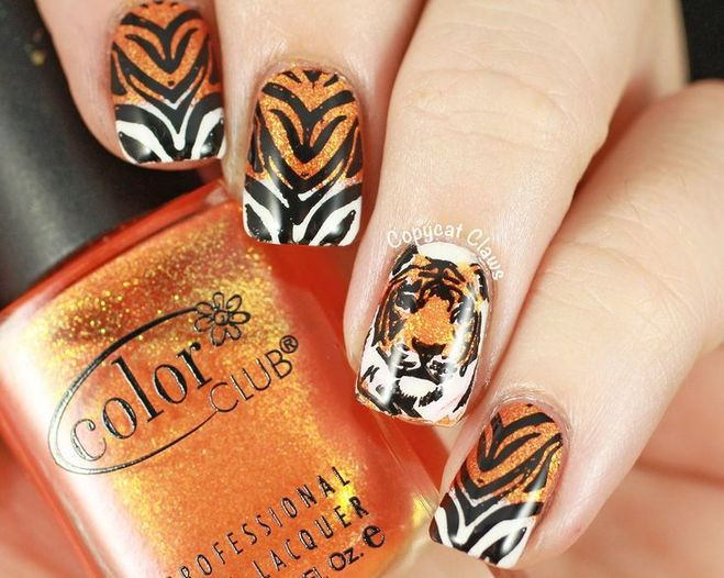 Новогодний дизайн ногтей может быть выполнен как на натуральные, так и на наращенные ногти, он может сочетать в себе разные цвета, а глаза можно выполнить стразами. Также символ года на ногтях можно выполнить в объеме пользуясь техникой объемной акриловой лепки. Например 2022 год это год Тигра, а ниже пример новогоднего маникюра.