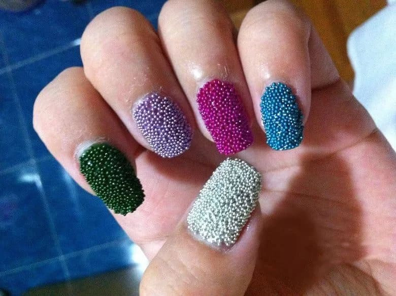 Его суть заключается в том, что после нанесения на ногти лака — основы и лака подходящего в тон внешнему покрытию, наносится само покрытие «икорные жемчужины» — небольшие шарики разных цветов и оттенков, бывают блестящие и матовые. Такой маникюр получается объемный и трехмерный, не очень практичный в повседневной жизни, но так поражающий своей красотой и роскошью.
