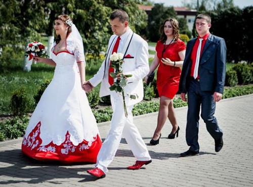 К свадебному наряду обязательно следует добавить некий незаметный постороннему взгляду элемент – можно брошку, можно булавку, можно заложить за лиф платья платочек. Если выберете оберегом платок – надежно укрепите его на платье, упавший платок на свадьбе сулит невесте скорое вдовство. Эта вещь станет оберегом невесты от дурного и завистливого взгляда. Хорошо, если подобный талисман невесте даст ее мать – сила материнского благословления защит невесту от любого зла. От сглаза сберегут и стежки синими нитками, которые можно сделать с изнанки подола. Нельзя выбирать желтое или ярко-алое свадебное платье. Приметы гласят, что желтый свадебный наряд сулит в семейной жизни частые ссоры, обиды, а красное платье привнесет в быт молодой четы серьезные скандалы, вплоть до полного разрыва. Не принесет счастья и голубой наряд невесты, по примете такое платье предвещает супружеские измены. Категорически воспрещается надевать черное платье – символ раннего вдовства. Платье с изобилием серебра – к счастливому, но недолгому браку.