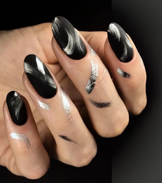 Невероятно эстетично и элегантно выглядит серебро. Такой эффект создается при помощи акриловой краски или геля, глянца, фольги, специального скотча, втирки или наклеек. Волшебный тандем — серебристые блестки и черный гель-лак. Можно создать эффект сказочного дождя, если вы нанесете блестки в малом количестве.