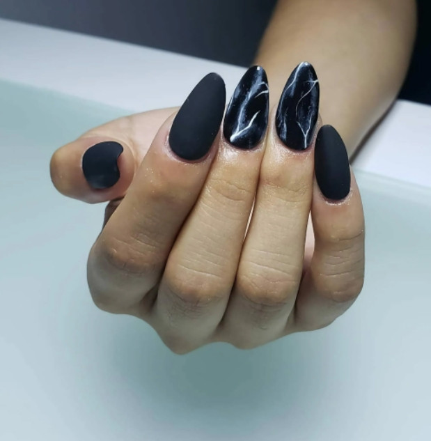 В топ лучших идей также входит мраморный черный маникюр. Это тандем роскоши и простоты. Он нравится девушкам из-за универсальности и красивого вида. Такой маникюр всегда будет выглядеть шикарно и стильно, а выполнить его может даже новичок. Мраморный маникюр в черном оформлении будет притягивать взгляды.