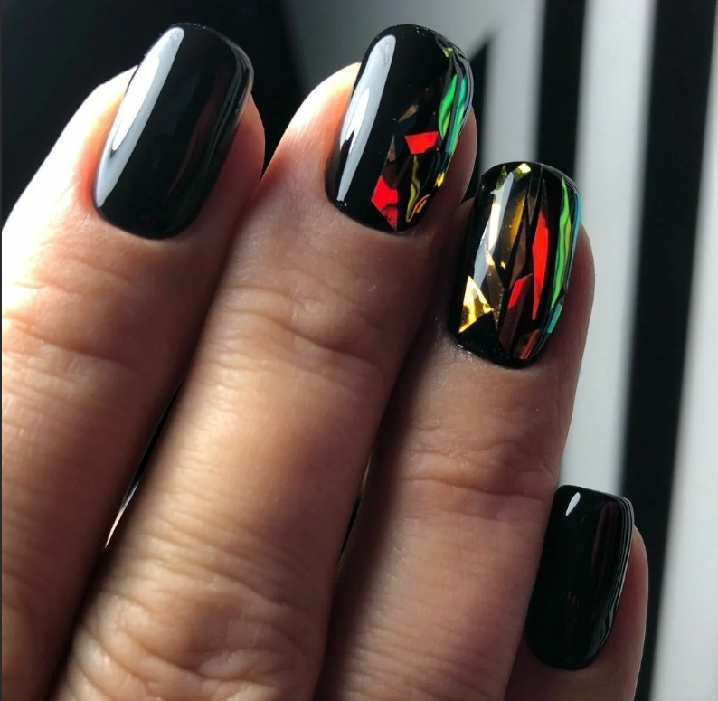 Лидирующую позицию занимает дизайн «битое стекло». Эффект достигается при помощи специальной фольги. Результат будет невероятно впечатляющим. На черной подложке голографические переливы фольги смотрятся волшебно и очень эффектно. Если добавить сюда объемные наклейки, маникюр приобретет ошеломляющий вид.