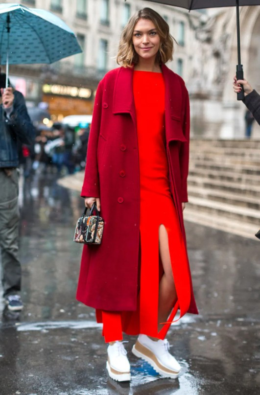- Красный. Яркий цвет считается настоящей классикой, отлично смотрится на брюнетках и шатенках. Его можно комбинировать с желтым, белым, черным и темно-синим. Однако стоит учитывать, что в таком случае пальто будет выступать в качестве основного акцента.