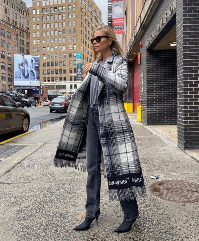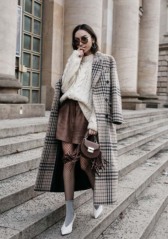 - В шотландскую клетку. Сложный орнамент требует тщательной работы над образом. Пальто в шотландскую клетку отлично подходит для дополнения черно-белых аутфитов, состоящих из базовых вещей.