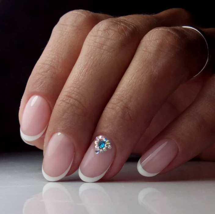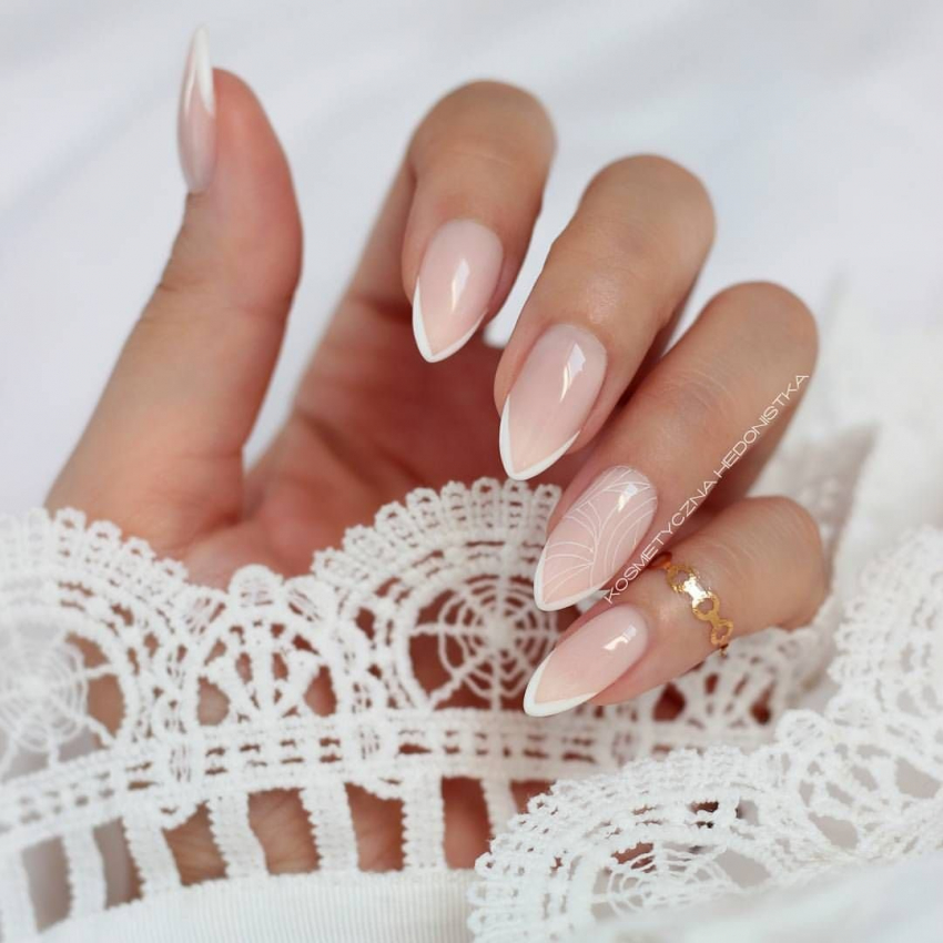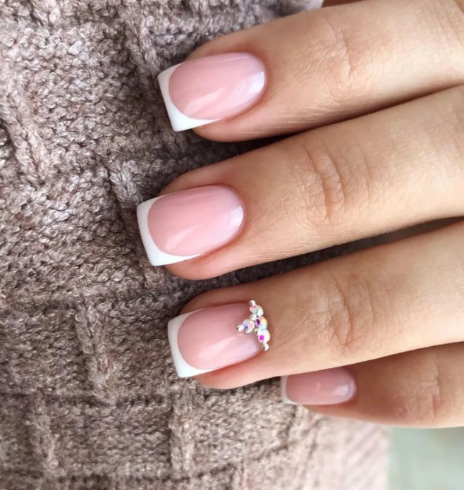 На изображениях и фото маникюра френч на короткие ногти 2023 часто появляются руки с маникюром для невест. Свадьба – это тот день для девушки, когда она чувствует себя принцессой. Ей хочется, чтобы всё было идеально: платье, прическа, макияж и, конечно же, маникюр. В памятном фотоальбоме на переднем плане будут видны аккуратные ручки невесты с изящным свадебным френчем. Для его создания потребуется нейтральная основа, белый лак и элементы декора, которые перекликаются с основным нарядом: стразы, бусины, перья и прочее.
