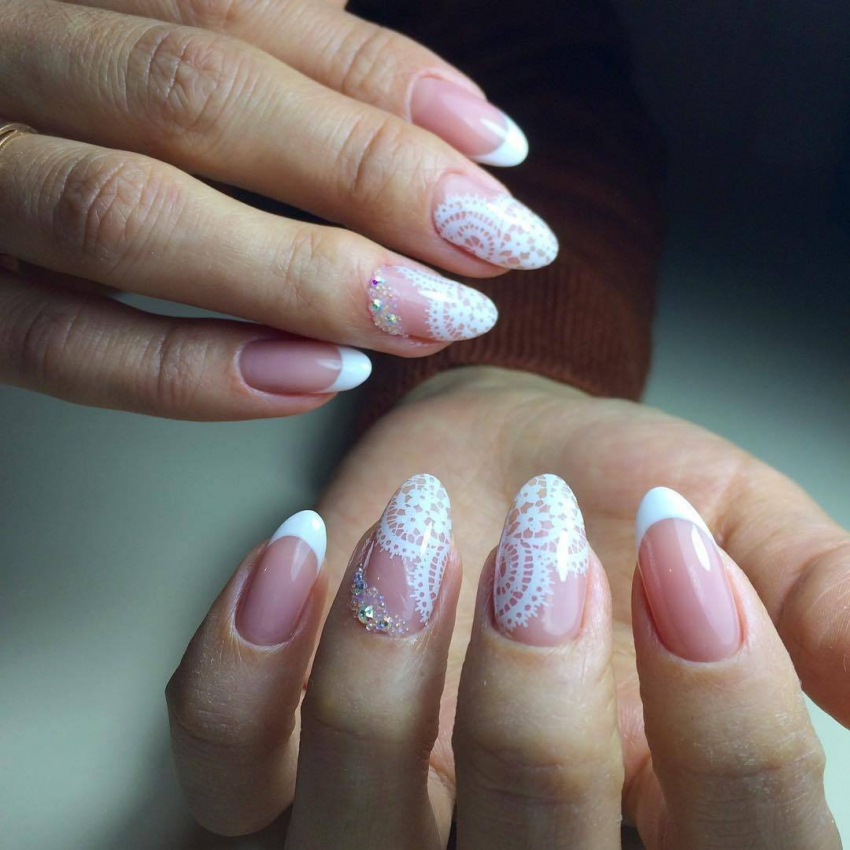 Кружево – хит сезона. Такое оформление подойдет романтичным натурам, которые выбирают нежный и элегантный маникюр. Кружево может отличаться между собой мотивами и орнаментом. Применить этот вид декора можно как на всех пальцах, так и на одном-двух ноготках. Красиво смотрится кружево со стразами.