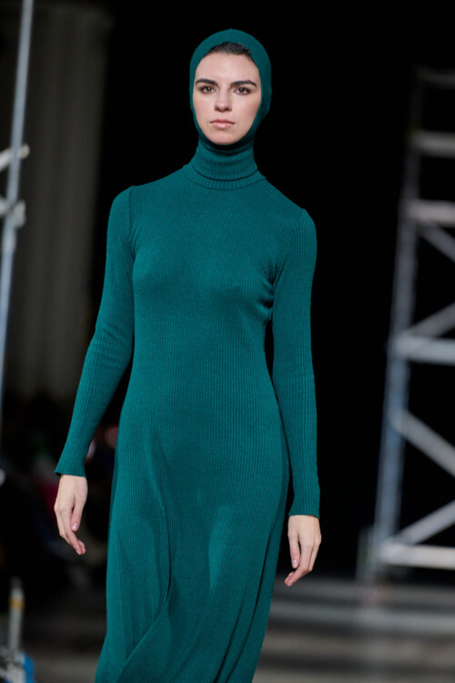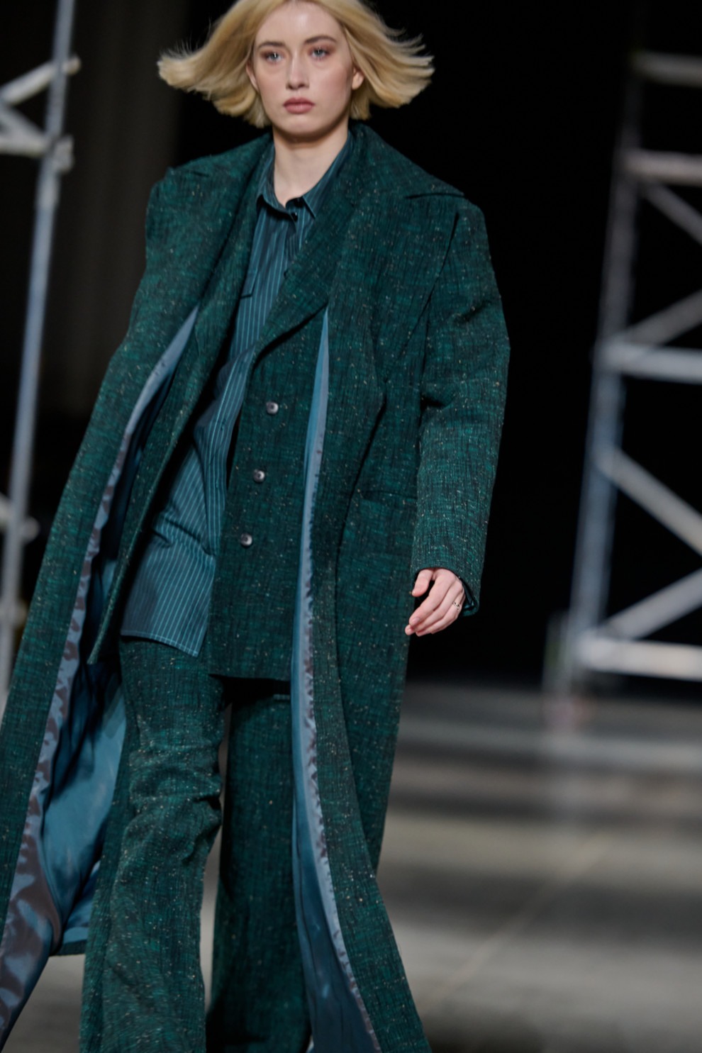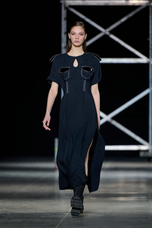 Алина Френдий на подиуме Vorozhbyt & Zemskova осень-зима 2022/2023Дизайнеры вновь делают акцент на стеганных элементах, которые применяют в комбинациях с различными материалами: бархатом, шерстью, твидом. Vorozhbyt & Zemskova решили, что не стоит ограничиваться только плащевкой. Многослойность предоставила возможность сыграть на контрастах, поэтому часто возникают комбинации мягкости со строгостью, как, например, в сочетании эко меха с холодным эко лаком. Жесткость и решительность характера big city girl было решено подчеркнуть пиджаками и блузами из мужской костюмной ткани, предавая образу некой маскулинности. Большой город нашел свое отображение и в силуэтах коллекции – они довольно массивные: широкие плечи, большие объемы, крупные детали. Стоит обратить внимание, как дизайнеры обыгрывают излюбленную металлическую фурнитуру – в этот раз используются застежки фастекс, которые менее деликатны в сравнении с ординарными вариантами.