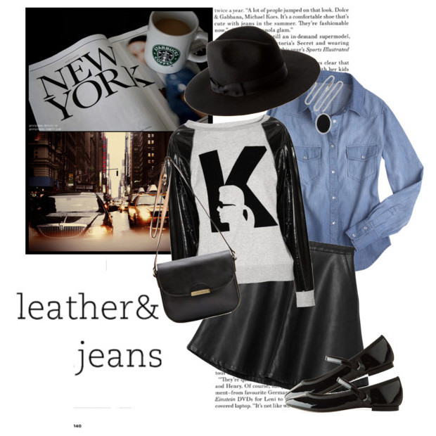 Весьма сочно смотрится сочетание денима с кожаными вещами. Дополните рубашку кожаной юбкой или леггинсами и туфельками. Классическая шляпа добавит образу немного таинственности. Если кожа будет раскрашена в металлические оттенки — получим самое модное сочетание в этом сезоне.