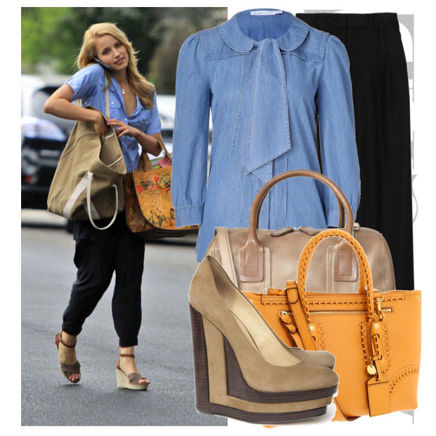 Женственные рубашки с круглым воротником, бантом или галстуком отлично будут сочетаться с брюками свободного покроя и танкеткой. Нежности и романтичности образу добавят крупные романтичные локоны и небольшой кулон.