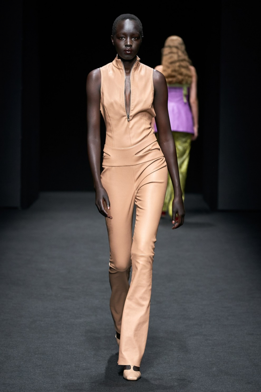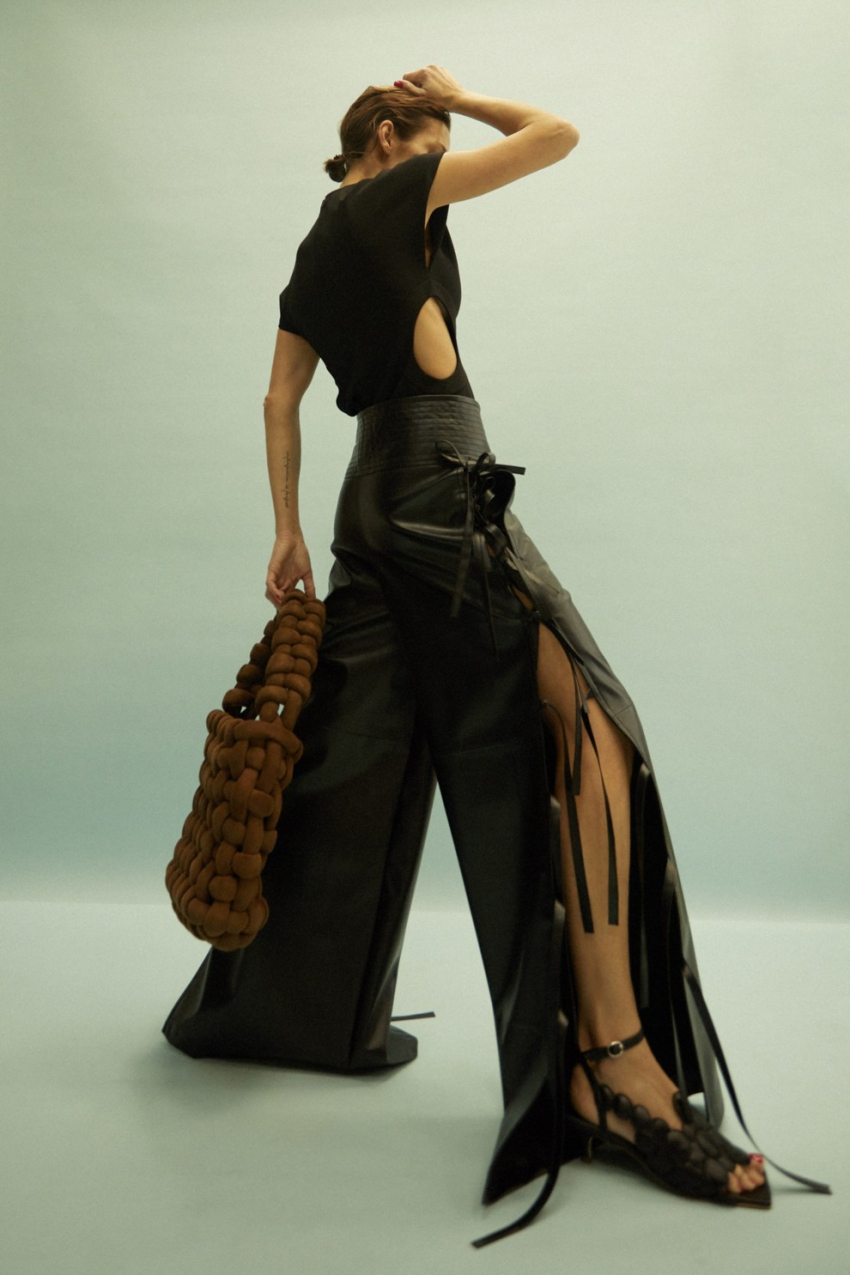Peter DoКожаКожаные брюки - главный фаворит модниц не только зимой, но и с приходом весны. Так, в марте и апреле, когда на улице еще не слишком жарко, но уже и не холодно, особенно приятно носить кожаные брюки. Актуальные модели могут быть как классического черного или бежевого цвета, так и выполнены в ярких оттенках, например, канареечно-желтые, как в коллекции Jil Sander. Кожаные брюки легко сочетать с любыми вещами, ведь они являются базовым элементом гардероба. Drome предлагают носить нюдовые брюки bootcut с таким же топом на молнии, Amiri сочетают их с клетчатой рубашкой, а A.W.A.K.E. Mode предлагают интересные брюки с разрезами по бокам, в которых точно модно будет выделится из общей массы.