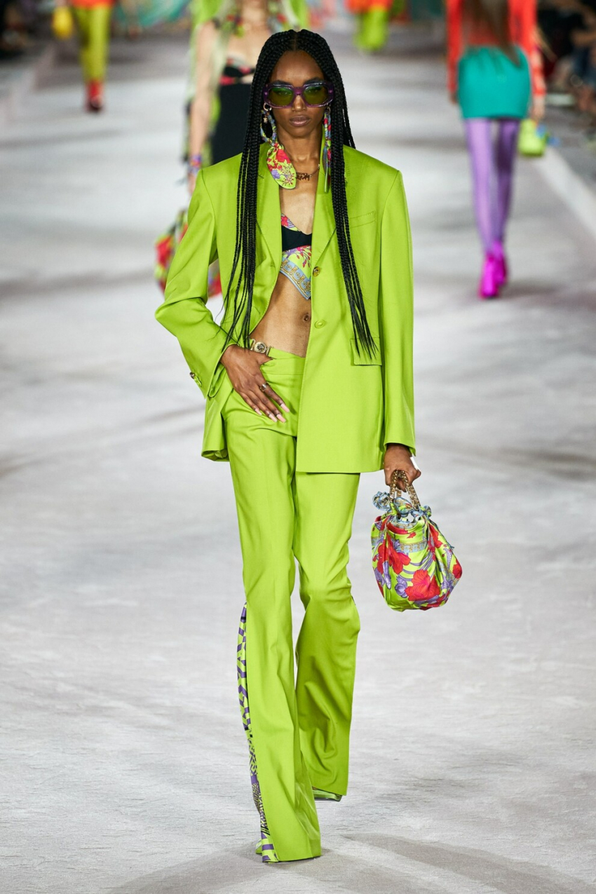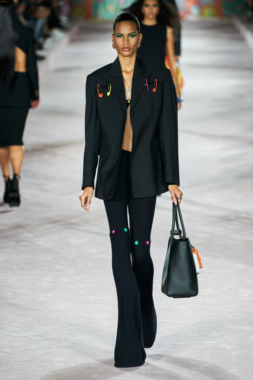 VersaceПолупрозрачные фактуры - один из самых модных трендов этого сезона. Нежный шелк, невесомая тюль, органза, деликатный шифон украсили коллекции весна-лето 2022. Знаменитости и streetstyle-звезды уже давно полюбили эту тенденцию, демонстрируя на красных дорожках смелые "голые" наряды. Однако помимо полупрозрачных платьев в коллекциях брендов можно встретить большое количество "голых" брюк. У Blumarine вы найдете брюки-карго из желтого шифона, у Balmain - трикотажную модель в черном цвете, у KNWLS - коричневые брюки, повторяющие контур фигуры, а у Allesandra Rich - вязаную крючком модель, в которой можно отправиться на пляж вместо туники.