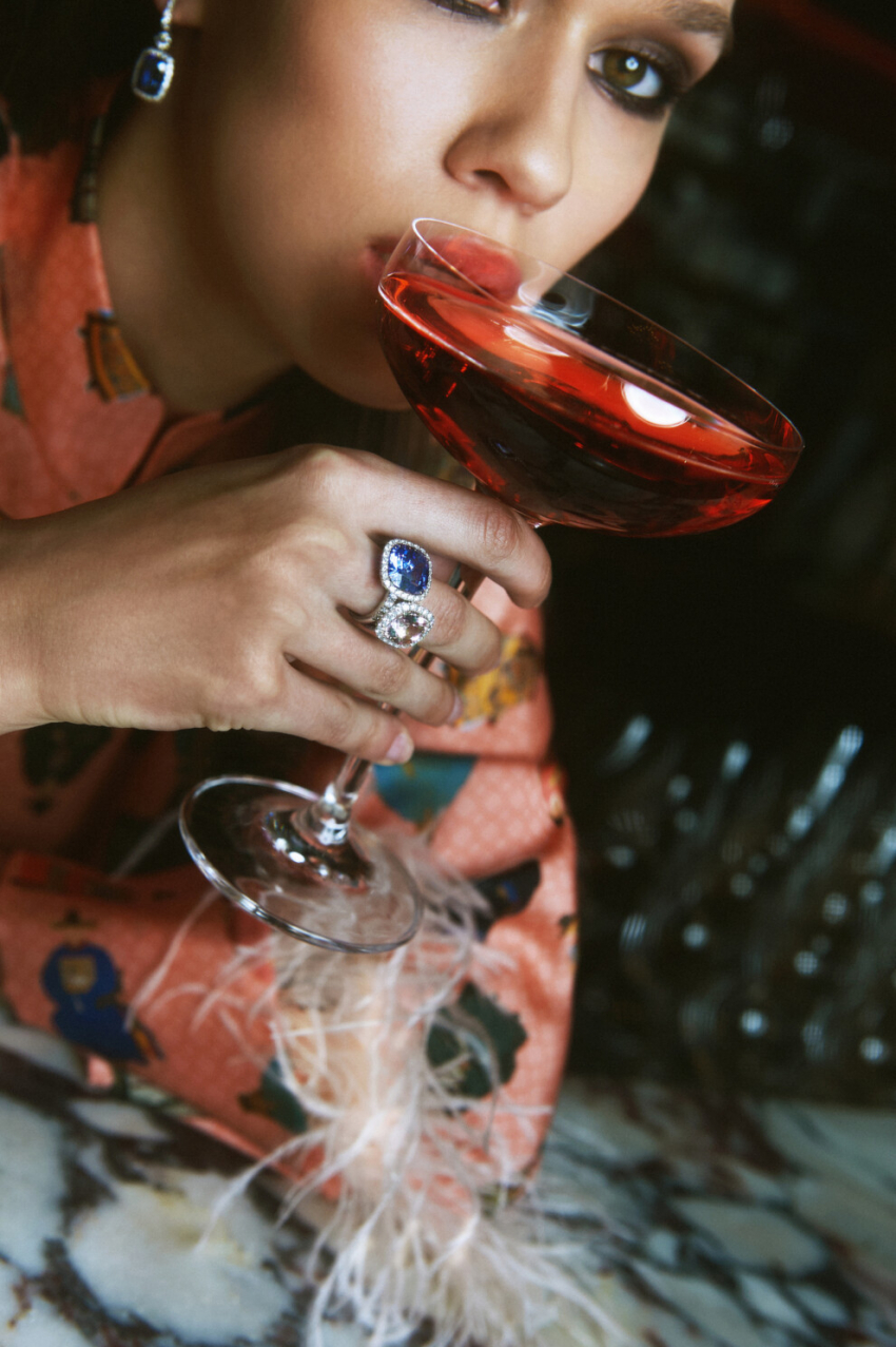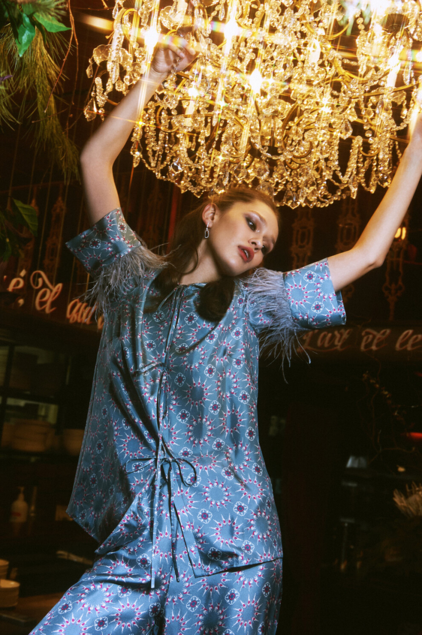 Образы в съемке дополнены изделиями ювелирного бренда OBERIG JEWELRY. В сочетании с шелком, оригинальными принтами и перьями изысканные украшения придают еще большего ощущения праздника.
