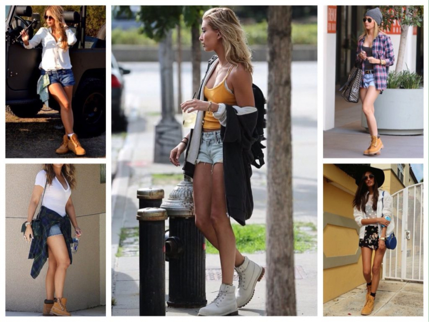 Несколько сезонов подряд стилисты рекомендуют для создания сексуального и смелого образа комбинировать тяжелые ботинки, в их числе и тимберленды, с короткими шортами с высокой талией. Эта деталь гардероба может быть пошита из различной ткани со всевозможным набором фурнитуры. Для создания образа в стиле гранж приобретите джинсовые шорты с бахромой, разрезами на штанинах, украшенные шипами или металлическими пирамидками. К ним идеально подойдет свободная майка или укороченный топ с провокационной надписью или с откровенным декольте, джинсовая куртка или кожаная «косуха» и тимберленды любого цвета.