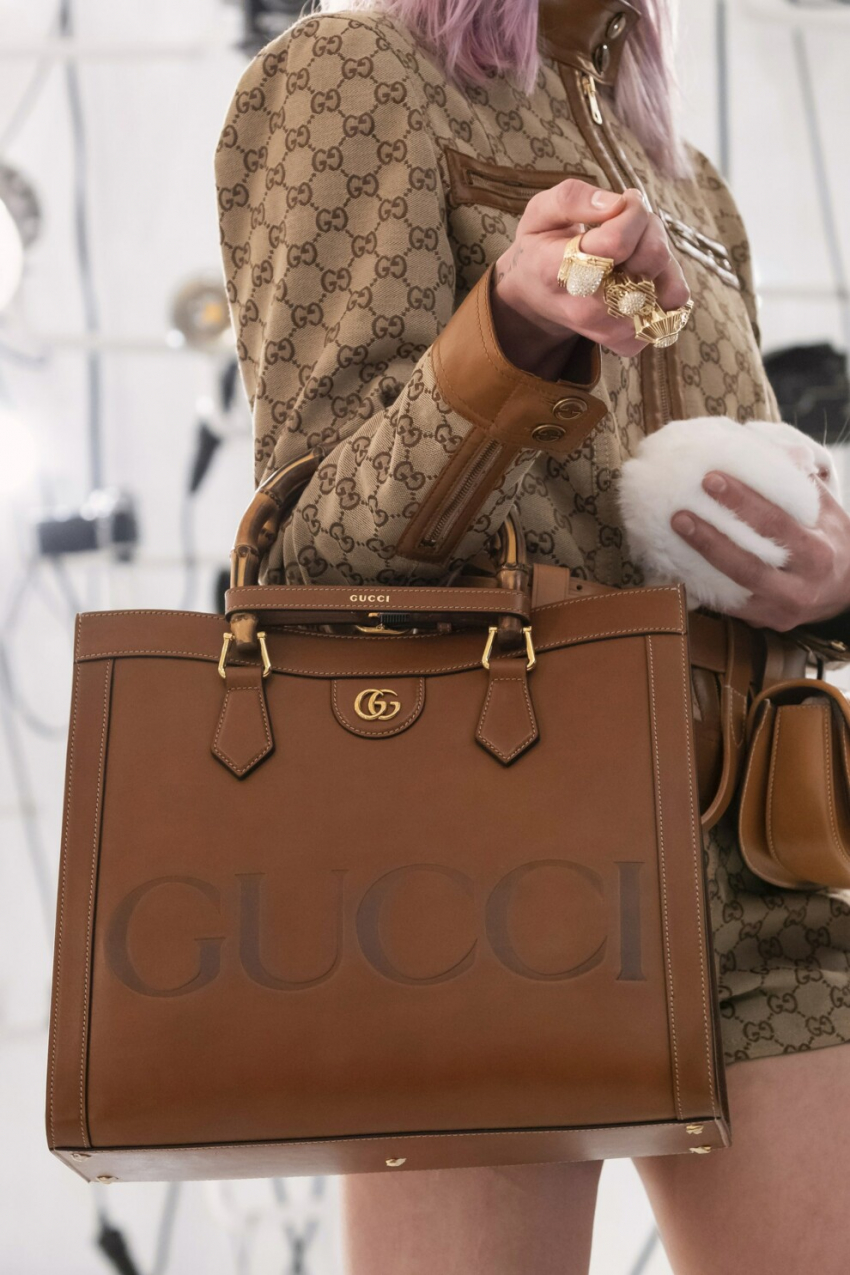 Сумка Gucci DianaGucci, осень-зима 2021/2022Gucci Diana с бамбуковой ручкой - еще один обновленный аксессуар, вызвавший огромный интерес модной публики. Bamboo bag появилась в итальянском модном Доме в 1947 году, вскоре после завершения войны. В 90-х сумка стала любимым аксессуаром Принцессы Дианы, которая с ней часто попадала в объективы фотокамер. В осенне-зимней коллекции 2021/2022 Алессандро Микеле показал обновленный тоут, получивший название Gucci Diana. Новая модель появилась в трех размерах и семи оттенках, а на кожаном ремешке, которым перевязаны основания бамбуковых ручек, можно выгравировать инициалы.