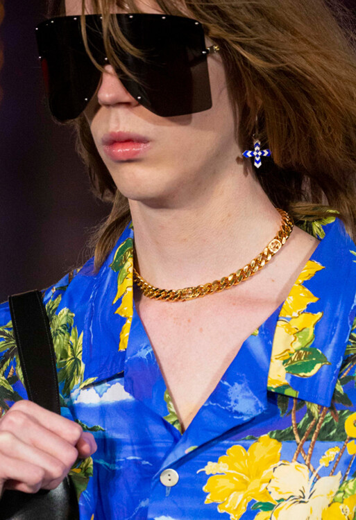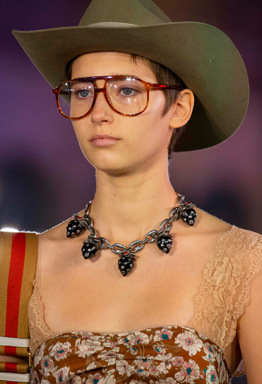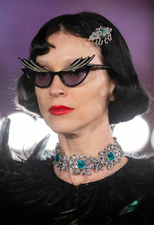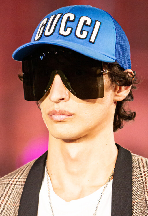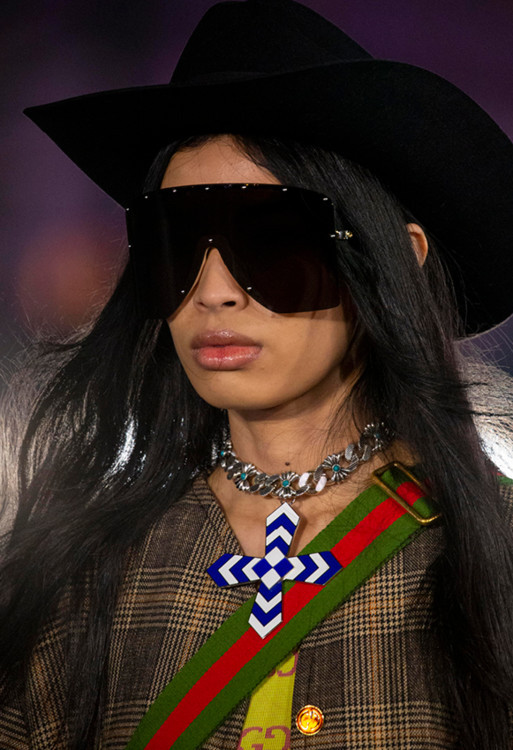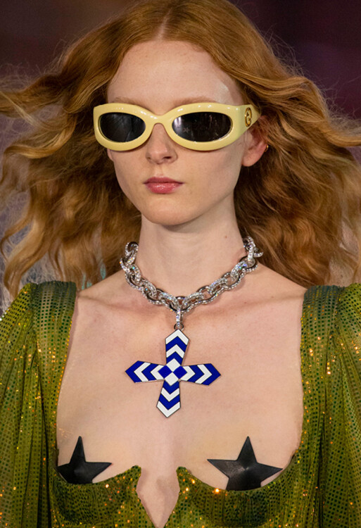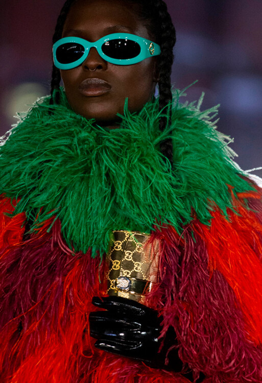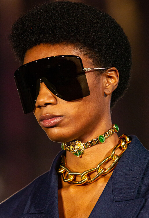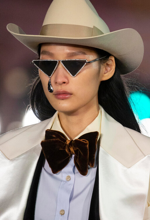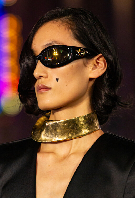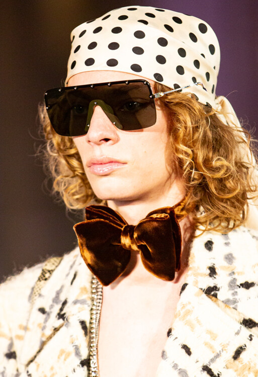Будущей весной Алессандро Микеле предлагает сфокусироваться на очках-масках, закрывающих половину лица. Кому такие модели кажутся слишком массивными, у дизайнера есть неменее эффектные треугольные очки, с цветными оправами или в стиле 1970-х.