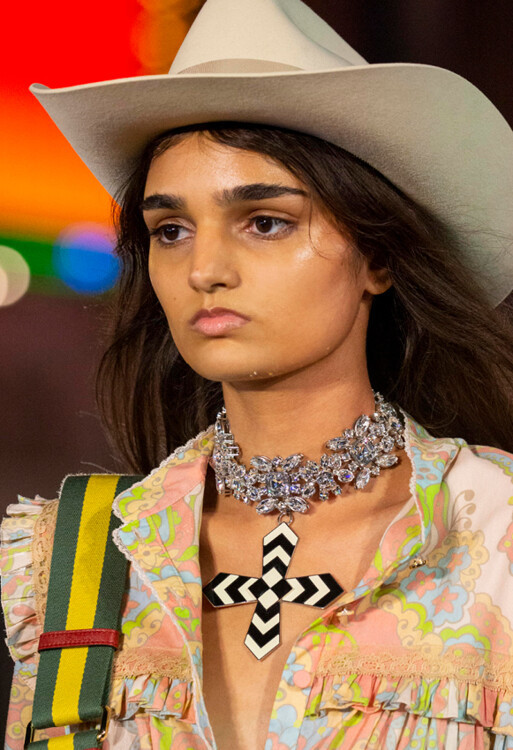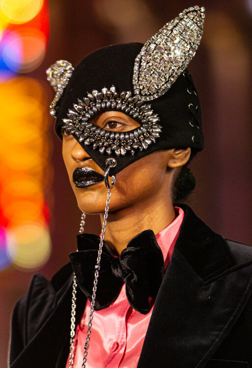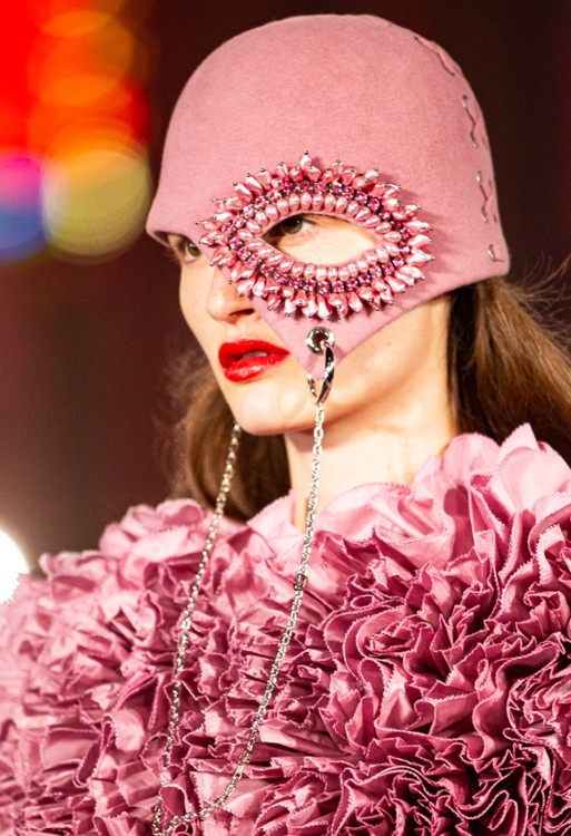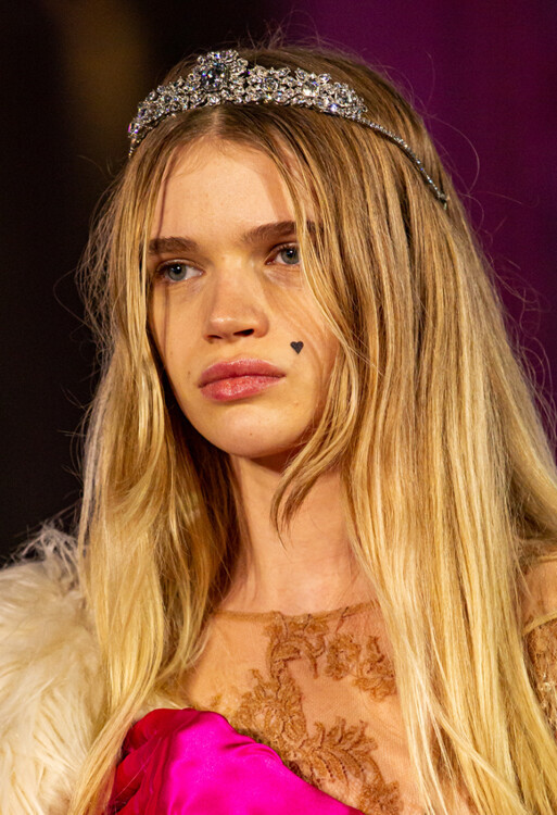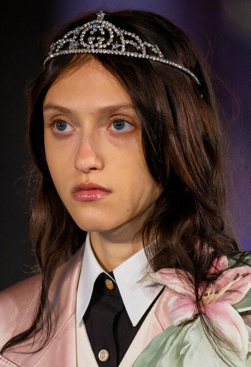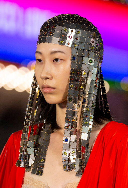 Практически каждый образ в новой коллекции был дополнен украшением на голову – от диадем до вязаных шапок, расшитыми металлизированными нитями.