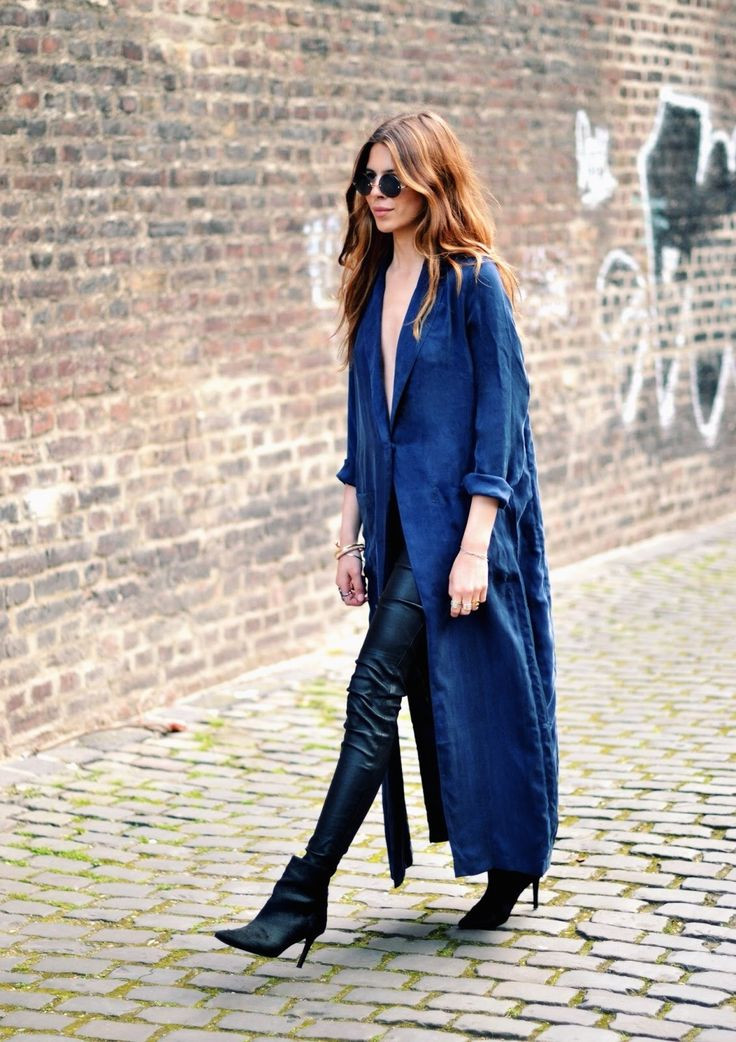 Модный джинсовый плащ можно сочетать с другой одеждой из денима. Очень необычно будет смотреться красивое платье из струящихся тканей, обувь на высоком каблуке и джинсовый плащ.