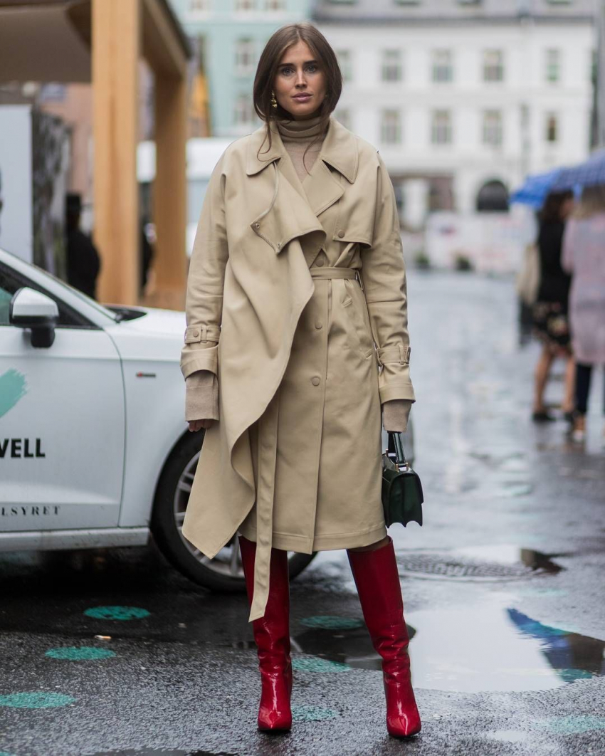 Нужно помнить, что с таким ярким тренчем хорошо будет сочетаться одежда более спокойных оттенков.