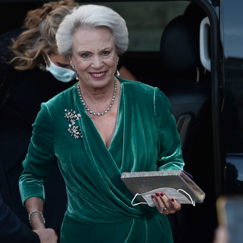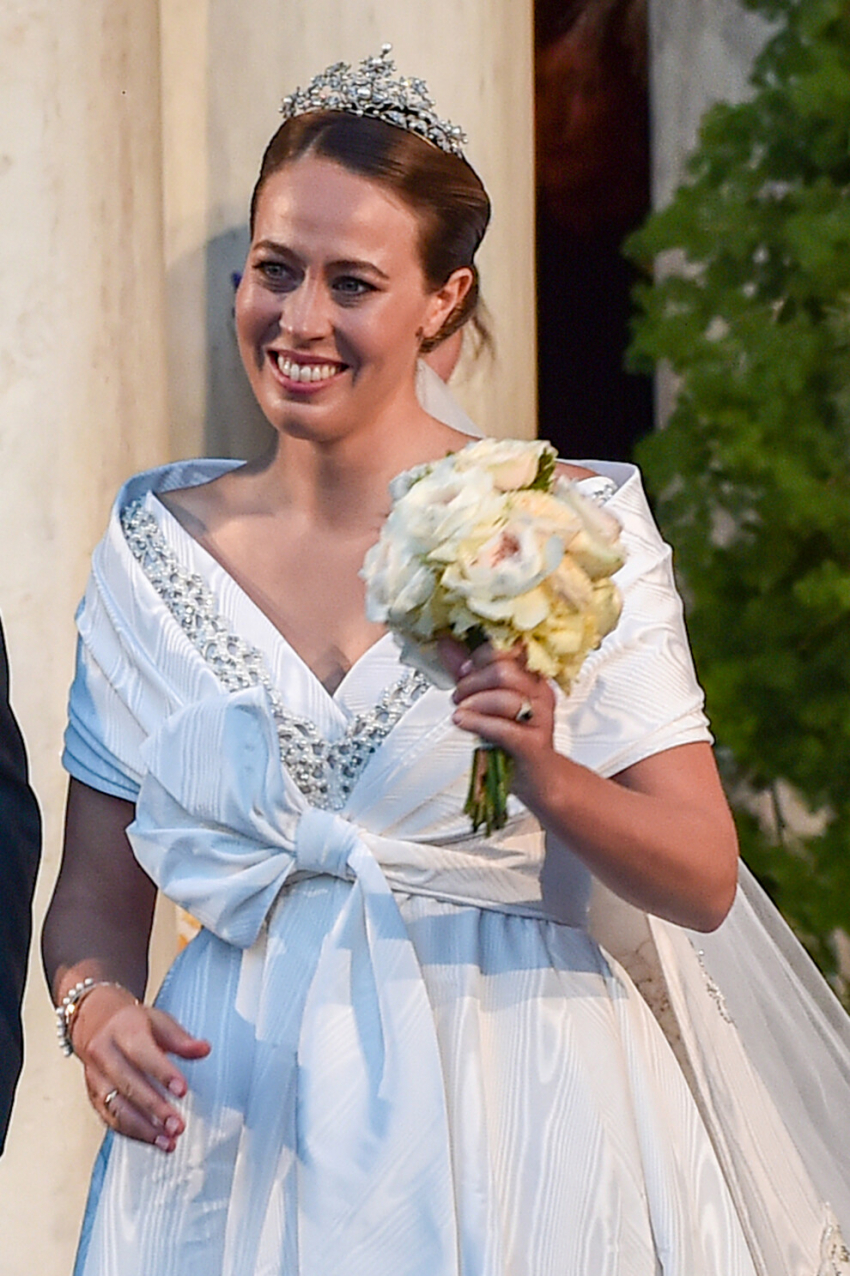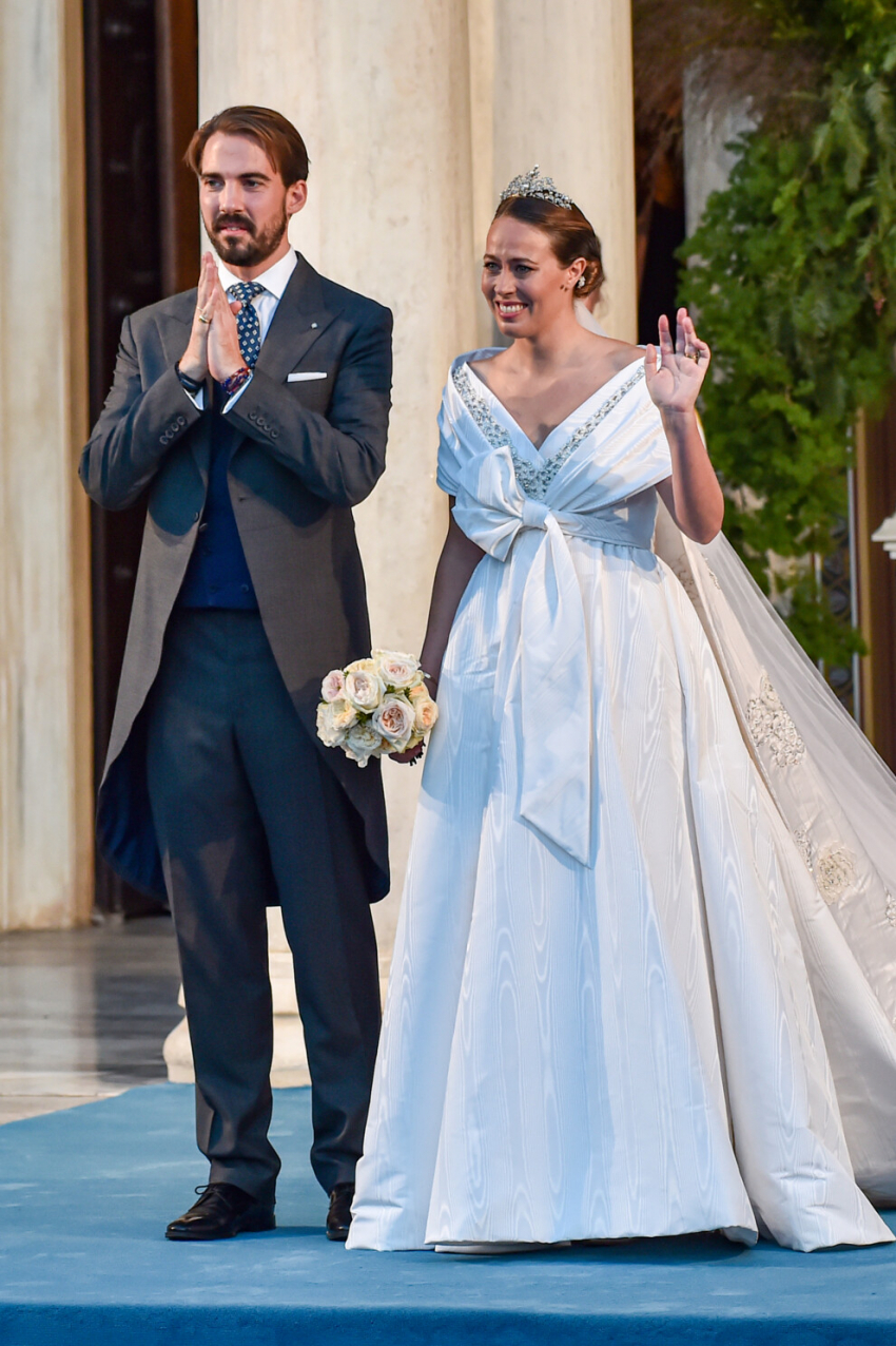 Свадьба принца Филиппа и Нины ФлорВ качестве свадебного платья невеста выбрала образ из белой шелковой муаровой тафты из коллекции Chanel осень-зима 2021/2022. Платье было украшено длинным шлейфом, тюлевой вуалью, нежной вышивкой из кристаллов и бантом на груди. Свой образ невеста завершила бриллиантовой тиарой скандинавского происхождения, которую королева Анна-Мария унаследовала за несколько недель до своей свадьбы с королем Константином.