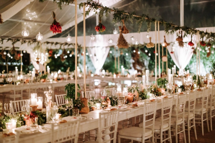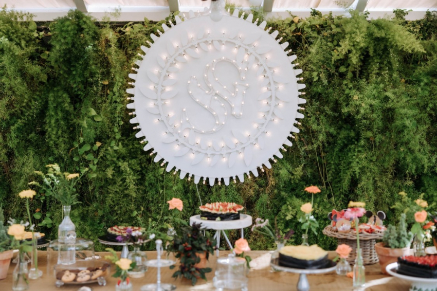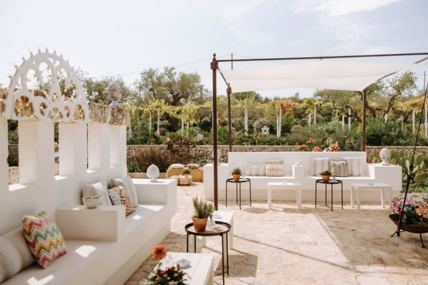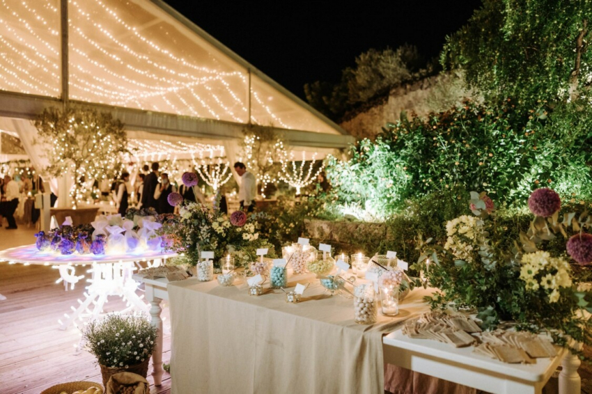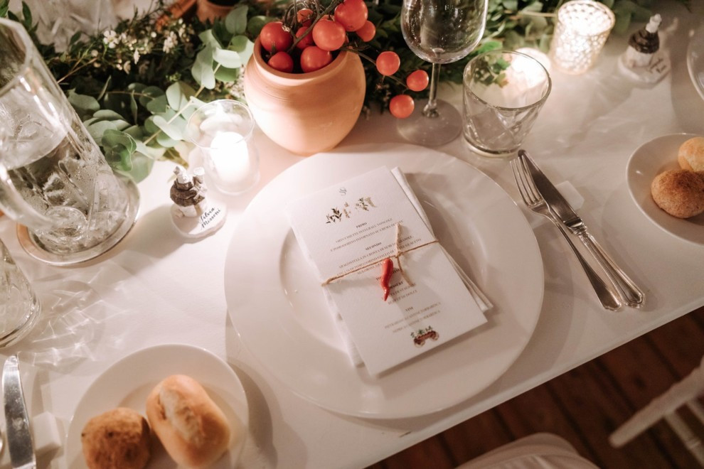 Свадьба Сильвия Торасса и Джакомо МиссониВажную роль в мизансцене, как и на церемонии венчания, сыграли любимые цветы невесты, которые были подвешены над длинными столами, подчеркивая загородный шарм свадьбы. Ароматические растения, типичные для апулийских огородов, дали название столам: лавр, тимьян, розмарин, перец чили, шалфей. Цель была достигнута - цветы окутали гостей типичными ароматами этой земли. Все было продумано до мелочей — за это спасибо команде Ottone Weddings, которая взяла на себя все вопросы по организации вечера.