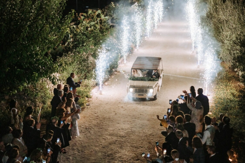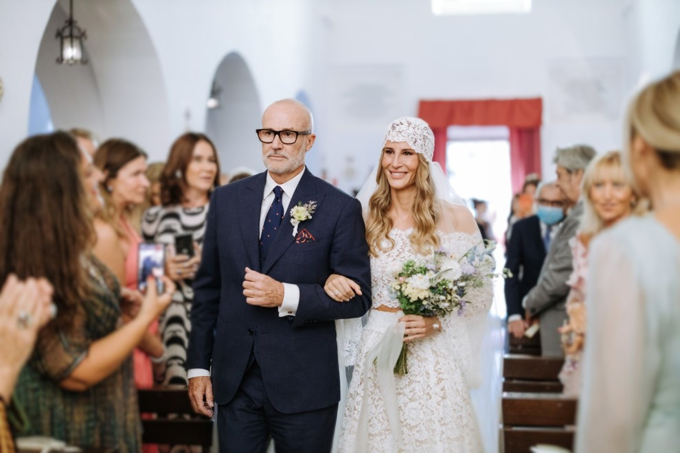 Сильвия с отцом Роберто ТорассойВоскресный бранч прошел на территории курортной резиденции Tenuta del Lauro в Локоротондо, принадлежащей матери Джакомо Тане. Вместе с Даниэлой Веккьо они организовали мероприятие, которое завершило торжество местными блюдами под народный танец пиццика. Перевозил молодеженов одной локации в другую Citroën Méhari — отреставрированный ретро-автомобиль отца жениха с салоном, отделанным тканями Missoni.