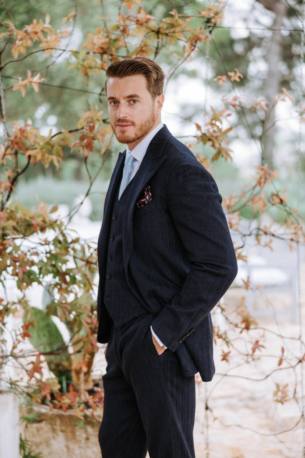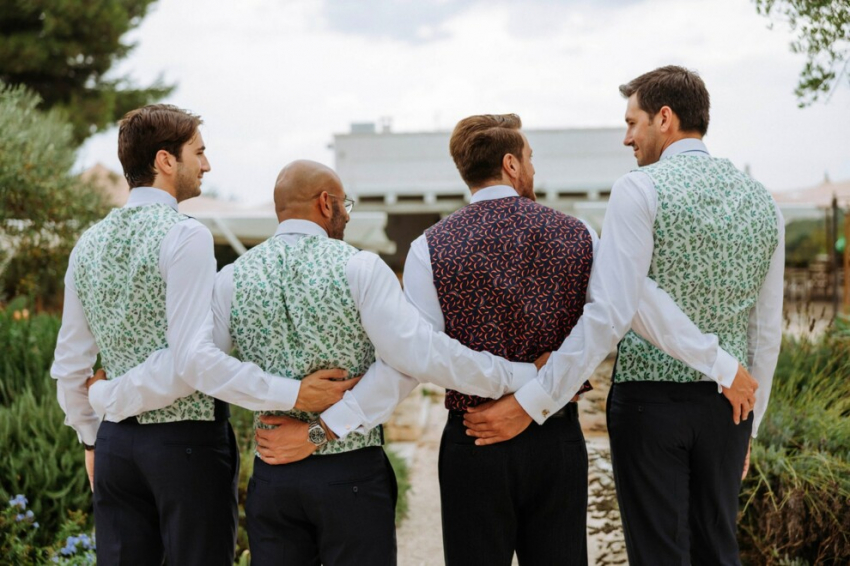 Джакомо МиссониДля церкви жених выбрал текстуру с культовым зигзагом, характеризующуюся сочетанием черного, темно-синего и шалфейно-зеленого оттенков. Дополнительными деталями стали жилет и клатч из шелкового твила с забавным принтом в виде перца чили и именами пары. Такие же жилеты, но с другим принтом (а именно с главными героями вечерней мизансцены, то есть ароматическими растениями. — Прим. ред.) — для свидетелей.