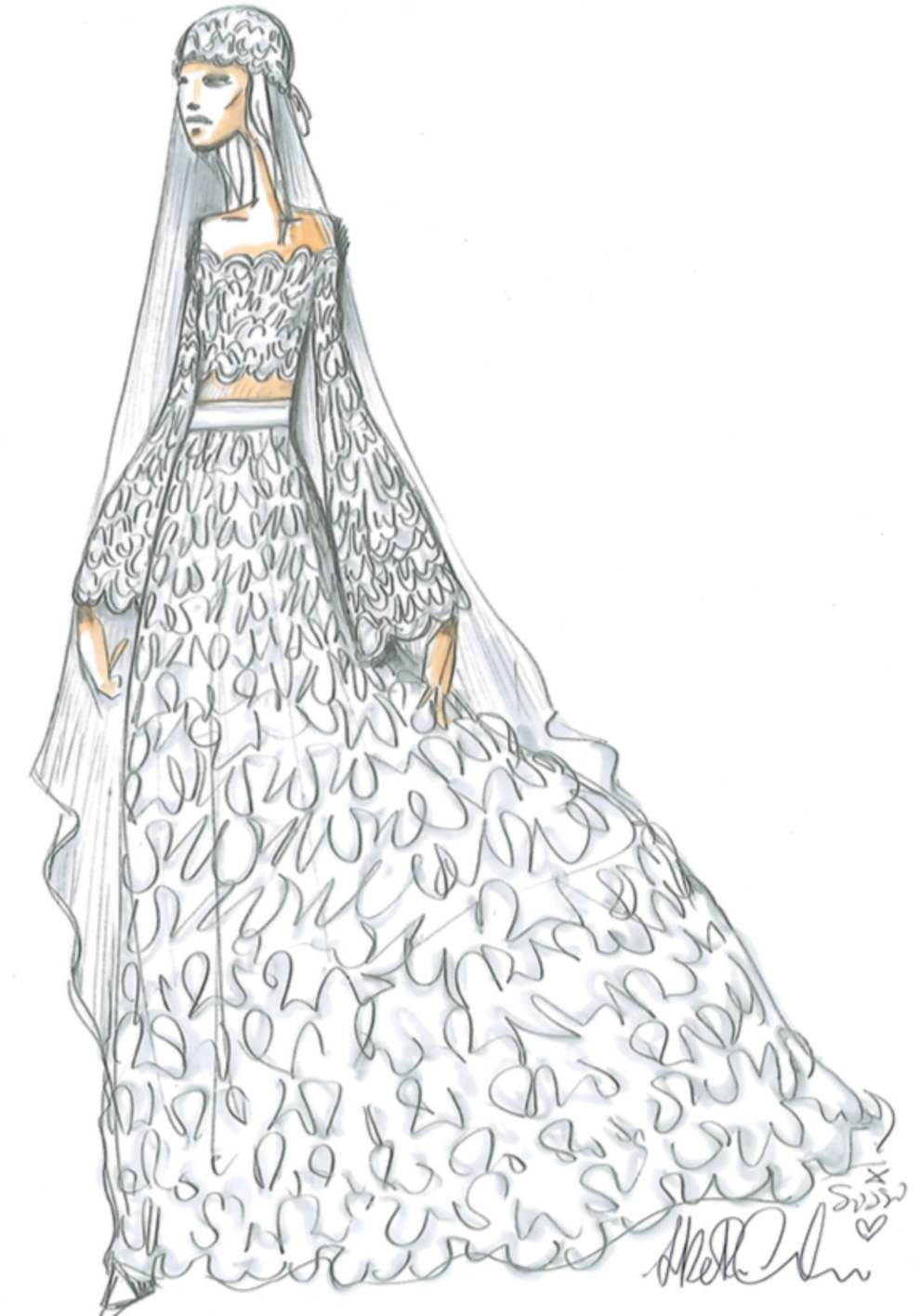 Эскиз свадебного платья, разработанный Альберто КалириНо давайте перейдем к наряду невесты в этот день, которое, по ее собственному желанию, отличалось от классических вечерних платьев. Активная и свободолюбивая Сильвия обратилась к своему другу, стилисту и модельеру Альберто Калири, который разработал для невесты платье, сшитое по эскизу в одном из туринских ателье. Сильвия выбрала образ, состоящий из кружева цвета слоновой кости с открытыми плечами и животом, который идеально подходил ей.