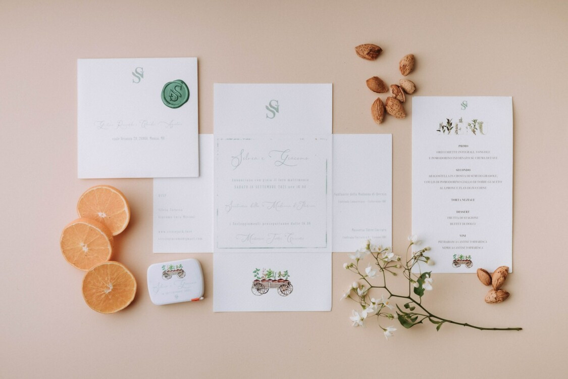 Свадьба Сильвия Торасса и Джакомо МиссониВместо карточек с именами на столах были фигурки в виде трулло (традиционный в Апулии дом с конической крышей. — Прим. ред.), которые гости могли оставить на память о торжестве, а вместо бонбоньерок — традиционное апулийское керамическое украшение «пумо» в виде бутона цветка. На этом подарки не закончились. Отец Сильвии, Роберто Торасса, вручил молодоженам историческую коробку конфет Mental с логотипом и датой свадьбы. Mental Fassi — кондитерская компания принадлежащая семье Торасса, которая существует много лет.