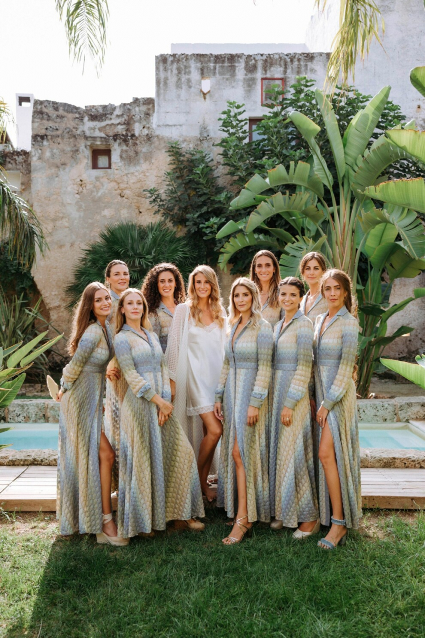 Невеста Сильвия и ее свидетельницыМакияж невесты был решительным, но не навязчивым. Сильвия выбрала бронзовый смоки айс и матовую помаду цвета капучино. Что касается свидетелей, то супруги подумали и о подружках невесты: для них были сшиты на заказ платья Missoni из тканей, идеально гармонирующих с красками природы и неба. Больше фотографий со свадьбы Джакомо Миссони и Сильвии Торраса смотрите в нашей галерее.