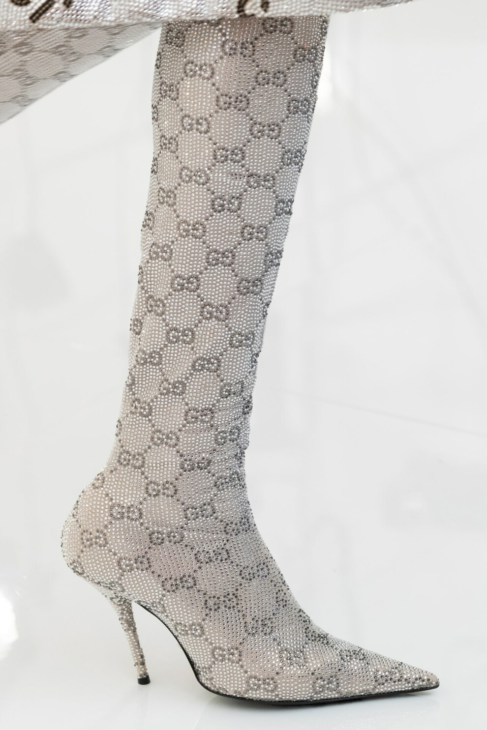 Металлические оттенкиGucciСтиль жизни slow life, главенствующий в постковидном мире, способствует демонстрации обуви в металлических оттенках, как у Prada, Victoria Beckham, Jil Sander и Gucci. Особое внимание на сапоги-доспехи от Balenciaga, которые были изготовлены по точным спецификациям Демны Гвасалии в традиционном средневековом оружейном складе на юге Франции.