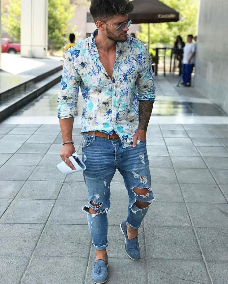 - Максимально популярен свободный крой чуть мятых рубашек, небрежно заправленных в рваные джинсы. Это актуальный мужской шик.