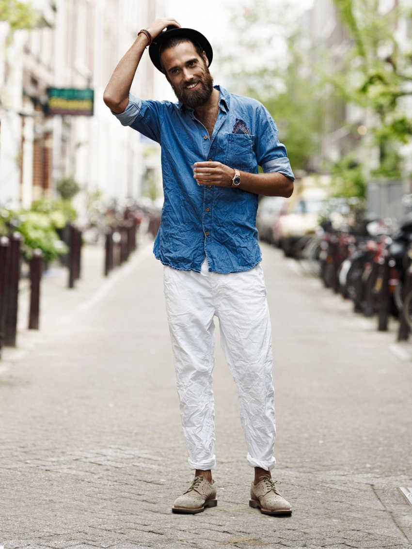 Boho для мужчин нашел интересное выражение – открытый ворот, собранные рукава, однотонные цвета или «огурцы», лоскутные сшивки. Образ отлично подойдет не только для пляжа на Бали, но и для городской повседневности.