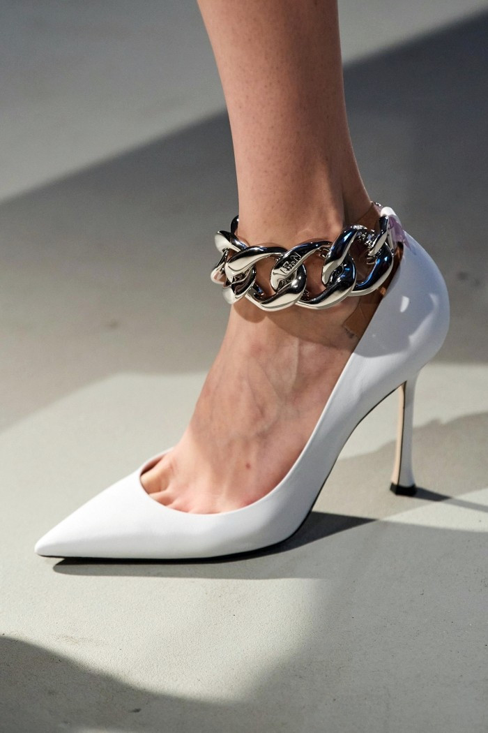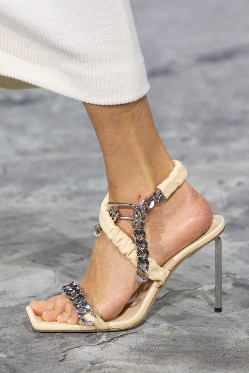 В 2022 году актуальность сохранят босоножки на шпильке с крупными цепями. Также эта деталь идеально выглядит на обуви без каблука. Сочетать пару с таким украшением можно в разных образах: