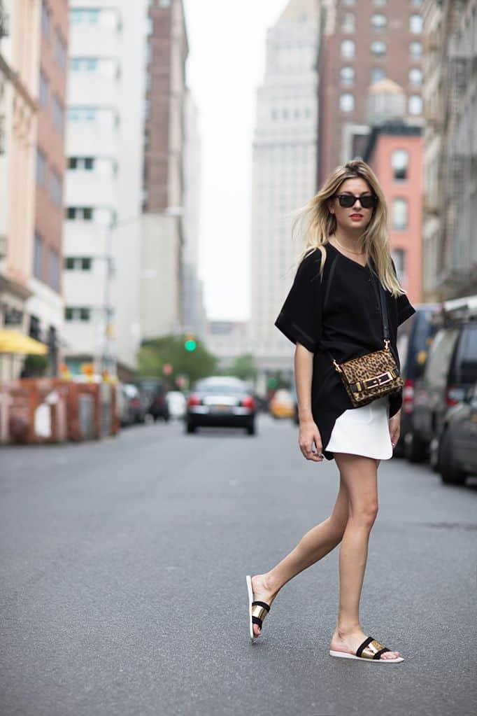 Босоножки на плоском ходу идеально сочетаются с короткой одеждой. Они не сделают образ вульгарным, как это может произойти с обувью на каблуке. Высота подошвы может быть любой. Для девушек, которым некомфортно передвигаться по каменистым дорогам, идеально подойдет пара на тракторной подошве.