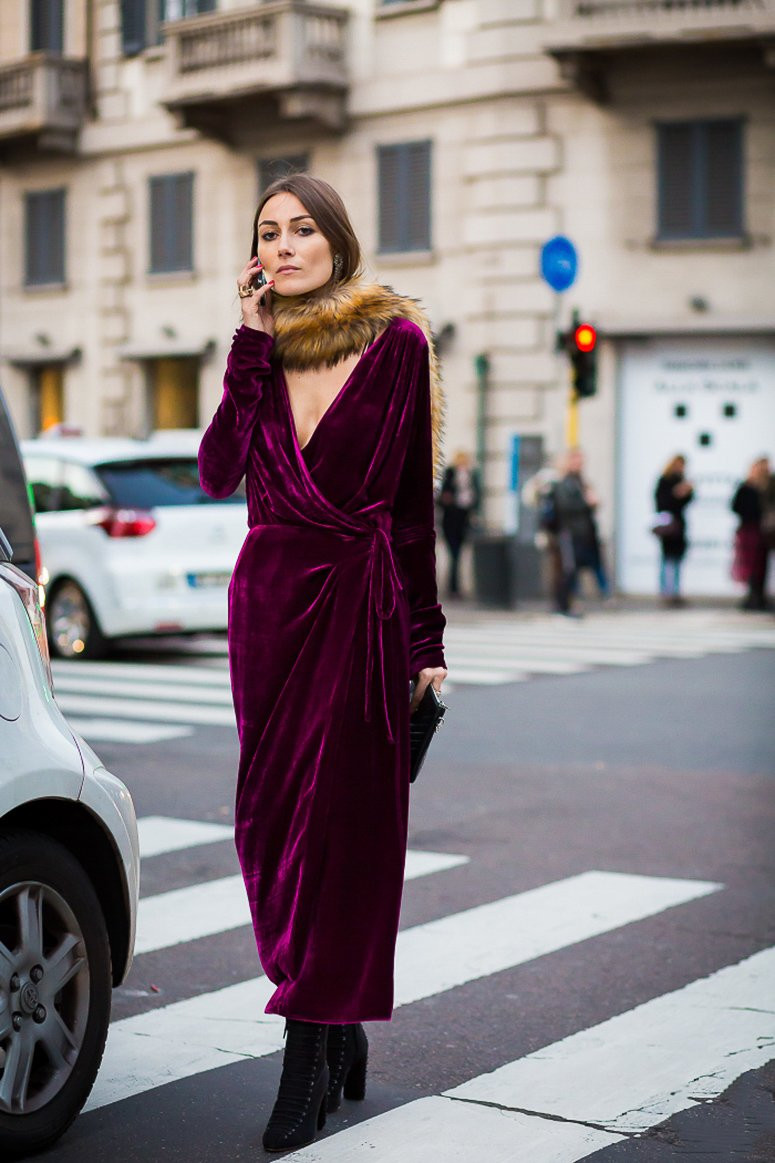 Модные платья, выполненные из такого шикарного материала, присутствуют в модных тенденциях не один сезон подряд. Официальный стиль, консервативность и комфорт – именно так описывают бархатные платья с запахом многие модницы. В 2022 году дизайнеры представили бархатные платья с красивой бахромой.