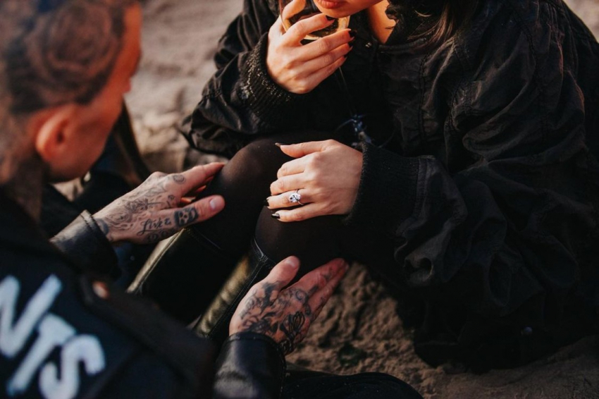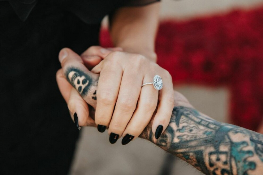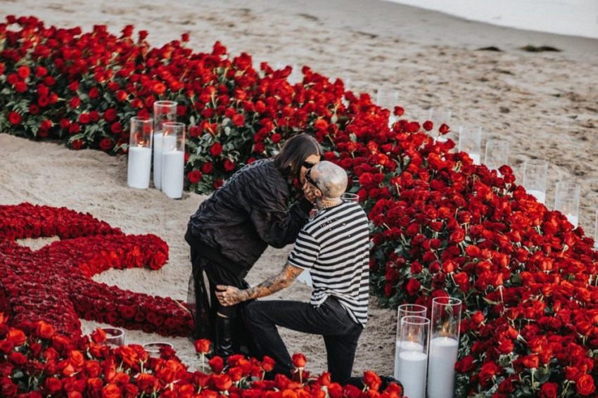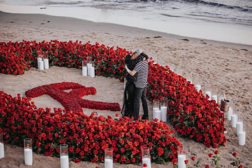 Кортни Кардашьян и Трэвис БаркерДля своей возлюбленной Трэвис украсил пляж огромной композицией из красных роз в виде сердца и выложил внутри их с Кортни инициалы «К» и «Т». Увенчали сюрприз свечи, расставленные по периметру. Трэвис встал перед Кортни на одно колено и спросил, готова ли она стать его женой. Музыкант подарил своей избраннице кольцо с крупным бриллиантом овальной огранки, разработанное дизайнером Лоррейн Шварц. Известно, что Трэвис принимал непосредственное участие в создании кольца.
