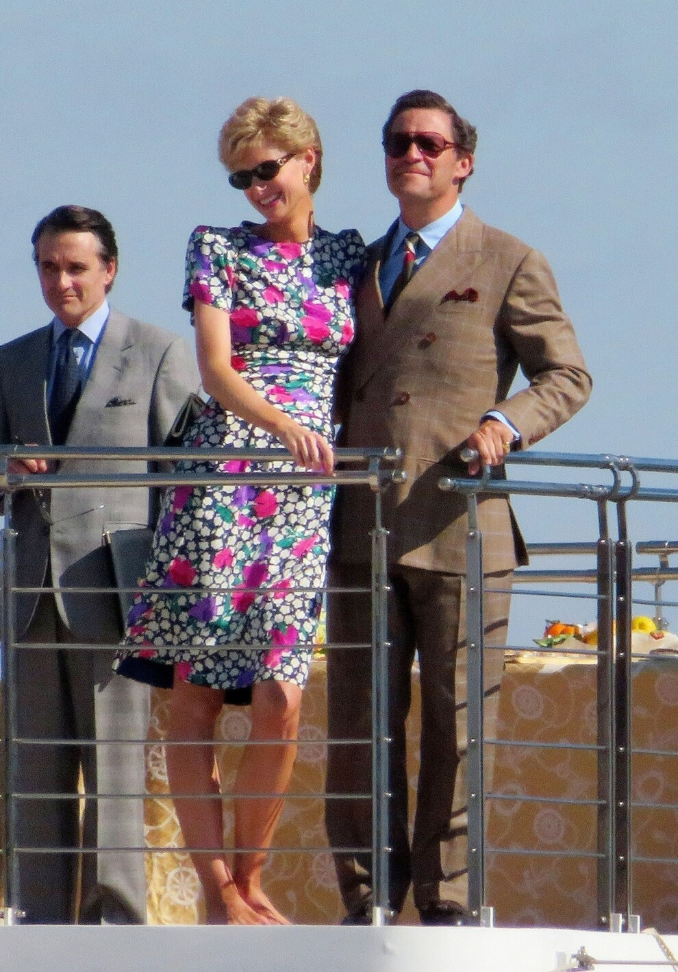 Элизабет Дебики и Доминик УэстВ кадре изображены Дебики и Доминик Уэст, который играет принца Чарльза. На снимке они позируют вместе на яхте. На Дебики платье с цветочным принтом и узкие солнцезащитные очки в стиле 90-х. Доминик Уэст одет в твидовый коричневый костюм, галстук и авиаторы. Сцена, вероятно, изображает поездку в 1991 году, когда королевская пара и их два сына Уильям и Гарри отправились в Италию на яхте принца Чарльза – буквально за несколько месяцев до объявления о своем расставании. Известно, что Netflix снимали эти сцены на Christina O, роскошной 325-футовой яхте, ранее принадлежавшей Аристотелю и Джеки Кеннеди Онассис, в Пальма-де-Майорка.