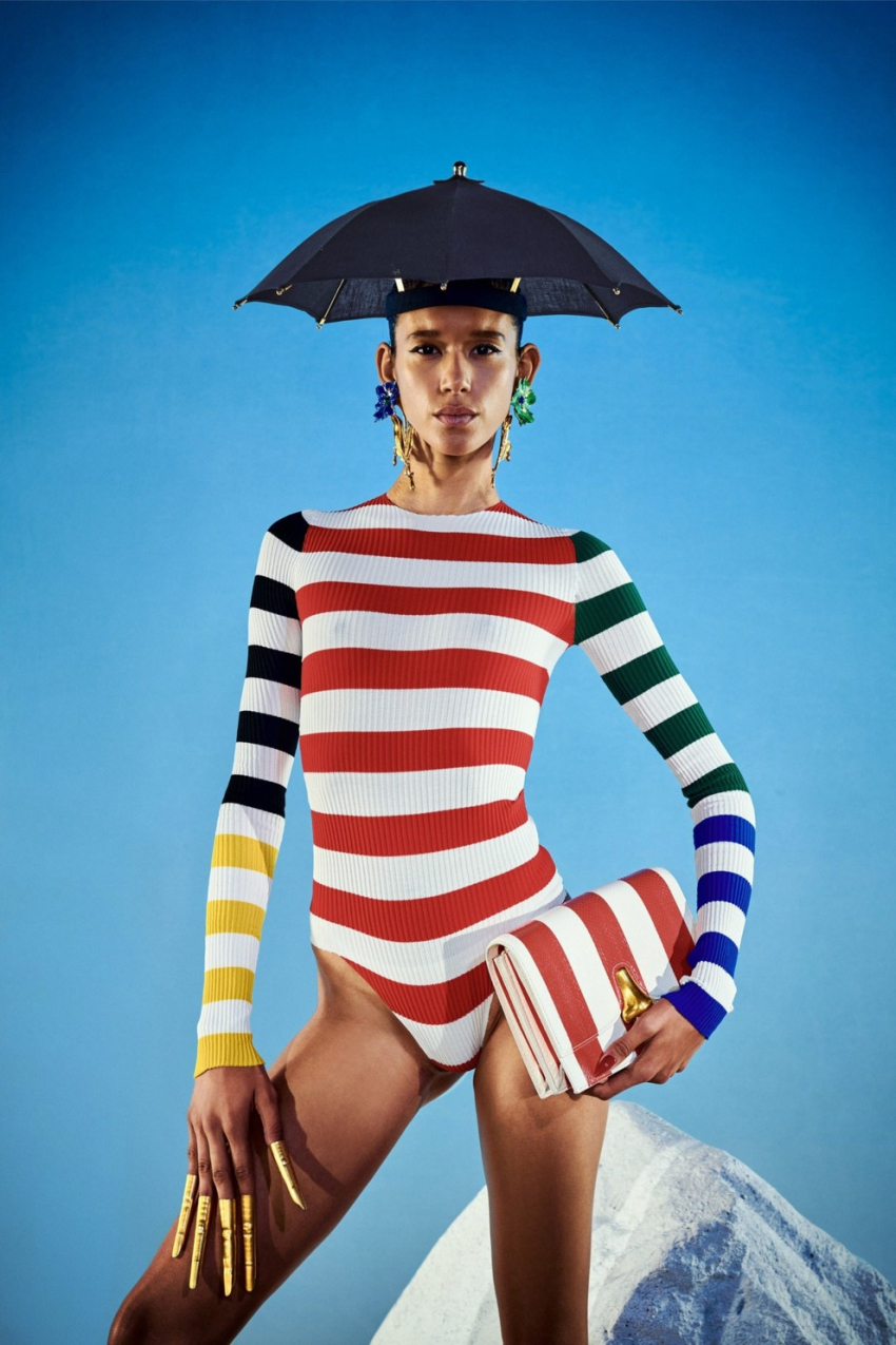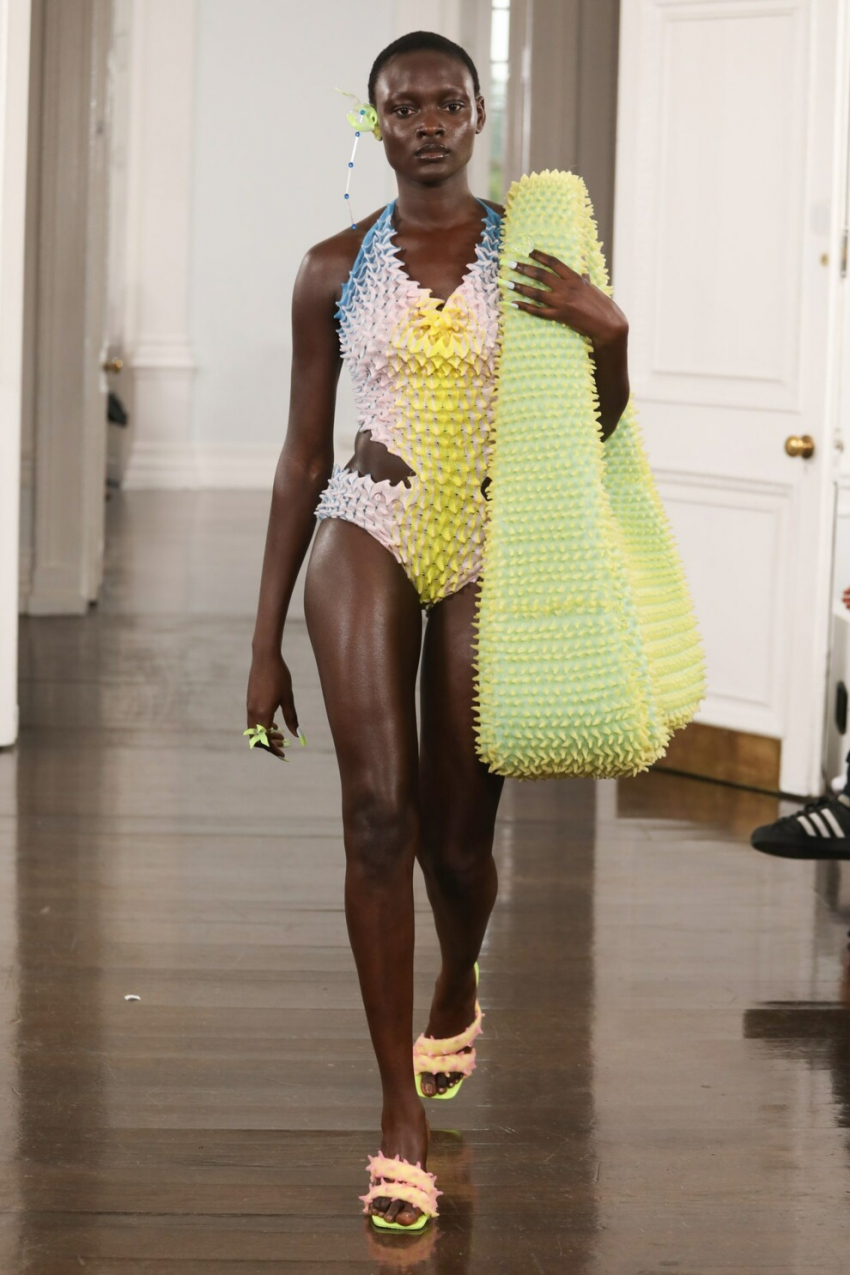 Chet LoChet Lo поразили публику своими красочными купальными костюмами, но особое внимание привлекли сумки с морскими существами, сшитые из фирменной колючей трикотажной ткани. Завершая свою дебютную коллекцию на Неделе моды в Лондоне, дизайнер показал объемную сумку, в которую поместятся все необходимые мелочи и многое другое.