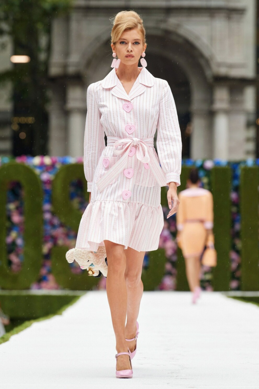 Richard QuinnШоу Ричарда Куинна весна-лето 2022 стало отходом от фирменного мира дизайнера: в этот раз в коллекции было меньше латекса и больше украшений и аксессуаров, в том числе чепчики Little Bo Peep, обрамляющие лица моделей.