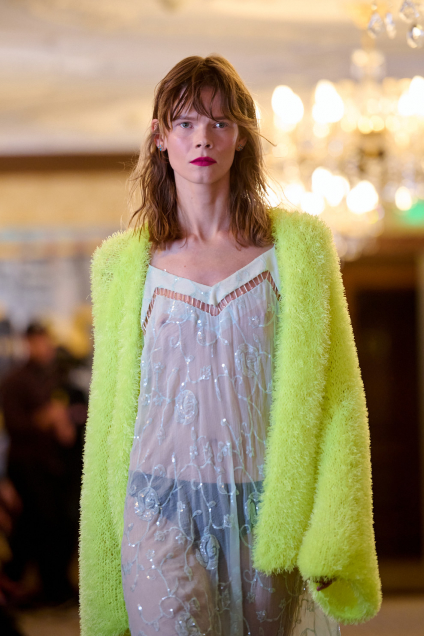 ARTEMKLIMCHUK весна-лето 2022Эти ощущения размеренности и спокойствия в коллекции Артем Климчук передал с помощью использования большого количества ручной работы – вязки, вышивки, декора, а также противопоставлению вещей подчеркнуто уютных и драматических. Благодаря этому чувственные наряды на тонких бретелях встретились с пушистыми кардиганами, белые сорочки стали отличной парой к полупрозрачным юбкам, а на безразмерных худи расцвели крупные бутоны, вышитые вручную.