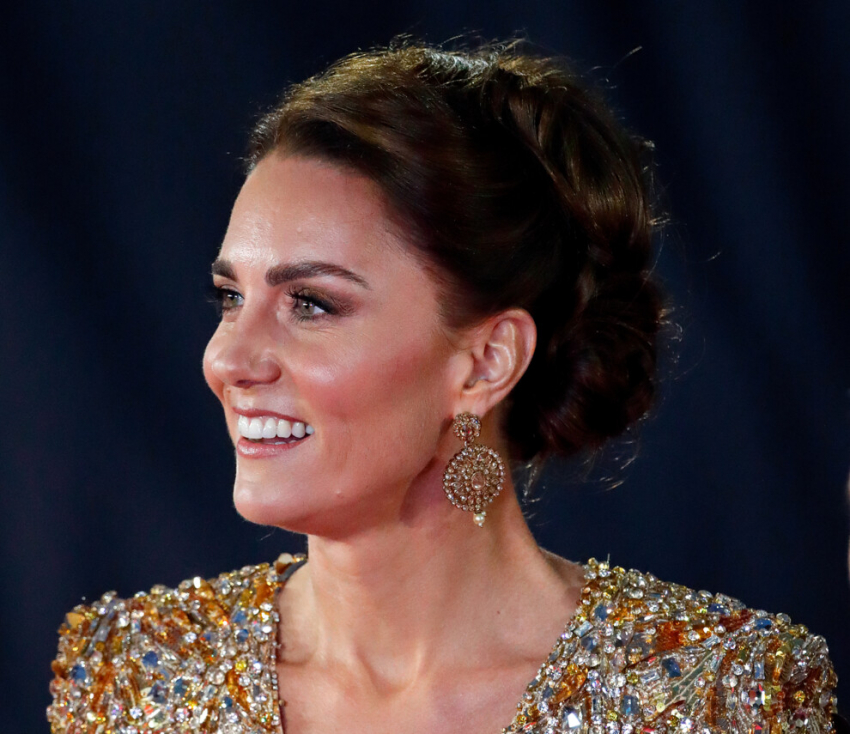 Герцогиня КэтринВ золотых тонах был выполнен и бьюти-образ Кейт Миддлтон. Визажисты сделали ставку на сочетание сияющей теплым цветом кожи и дымчатого макияжа глаз в коричневых оттенках. Финальным штрихом стала высокая вечерняя укладка, открывающая шею и серьги.