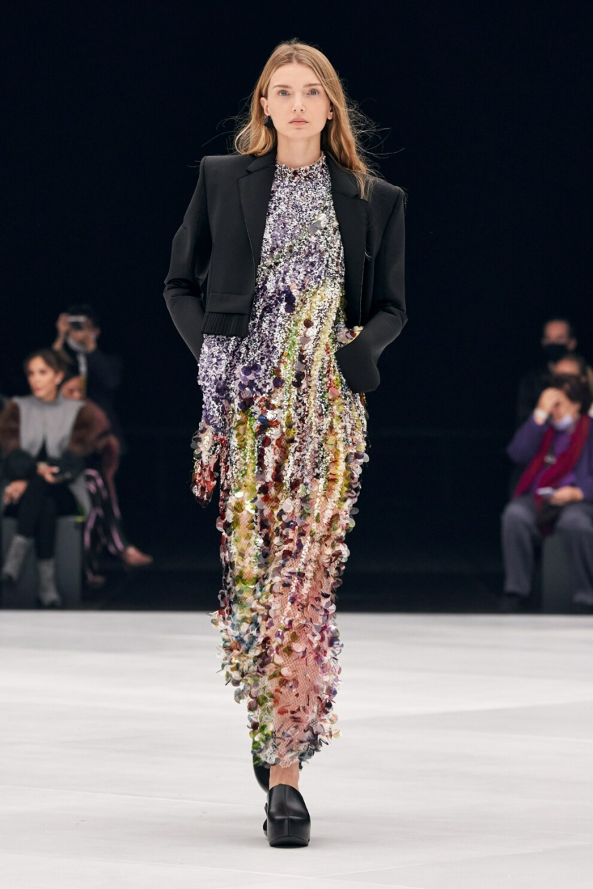 Givenchy весна-лето 2022Взявшись за силуэт 1940-х годов — с характерными скульптурными плечами и утонченной талией — дизайнер изготавливал и декорировал поверхности каждого предмета одежды так, чтобы все детали можно было увидеть даже издалека. Брюки взрывались фонтаном из рюш, платья были инкрустированы толстыми шелестящими блестками, а жакеты-болеро вздымались благодаря плотной микроплиссированной структуре.
