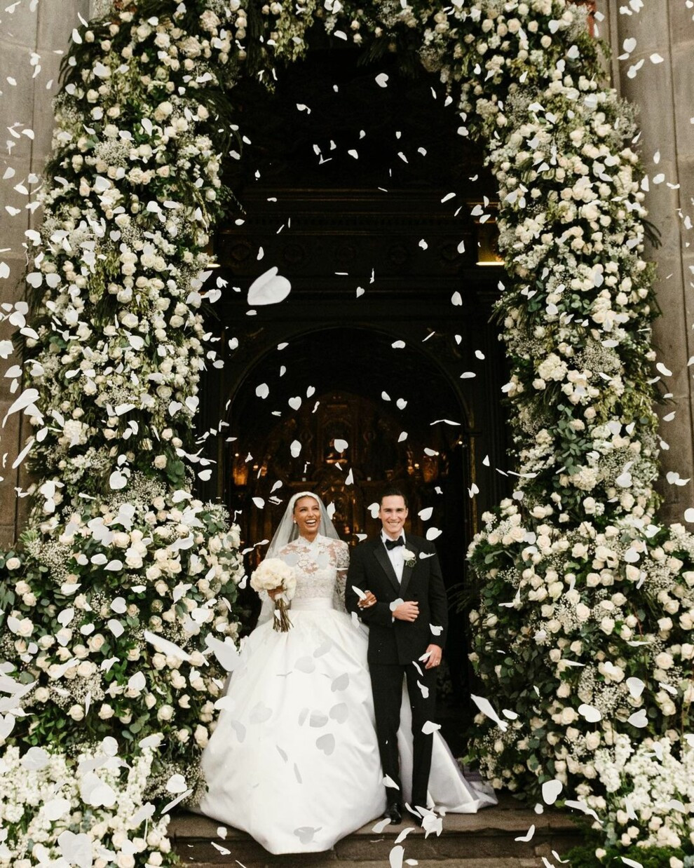 Жасмин и Хуан отпраздновали свою свадьбу в столице Эквадора. Церемония прошла в католической церкви в центре Кито. Жасмин давно знала, что хочет идти под венец в Zuhair Murad. «Я хотела, чтобы Зухаир Мурад сшил мне платье с того момента, как я пришла на его первый кутюрный показ, — говорит она. — Я отправила ему свой референс, и он нарисовал самое красивое платье, которое я когда-либо видела». К драматично пышному платью со шлейфом длинной 4,5 метра Жасмин выбрала простые украшения — бриллиантовые серьги Ritani и ее обручальное кольцо. Обула модель белые атласные туфли, которые были сделаны на заказ брендом Sarah Flint. На Хуане был двубортный смокинг Giorgio Armani. Подружки невесты были одеты в элегантные платья Amsale.
