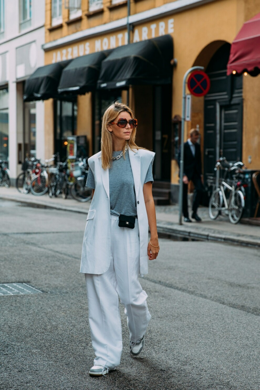 Костюм с жилетомФото: STYLEDUMONDEЕще одна константа текущего сезона - оверсайз-блейзеры, брюки со стрелками и, конечно же, строгие костюмы. Заменив пиджак жилетом, вы добьетесь нужного эффекта, даже если на улице слишком тепло для шерстяного жакета. Комбинация с футболкой и кроссовками даст возможность позаигрывать с привычным повседневным образом.