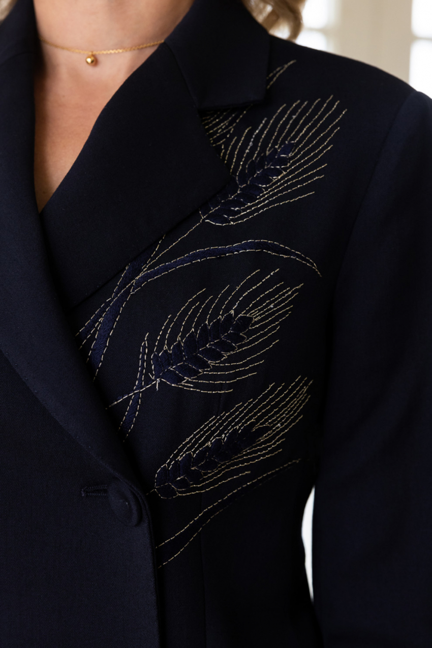 ARTEMKLIMCHUK – один из любимых брендов первой леди. Именно ему она доверила создание костюма для инаугурации президента Украины Владимира Зеленского и затем не единожды появлялась в костюмах авторства Артема Климчука. Выполнена двойка в классическом стиле и украшена вышивкой в виде колосьев – одной из визитных карточек ARTEMKLIMCHUK. Дополнили образ украшения из коллекции брендов GUNIA Project и Guzema Jewelry.