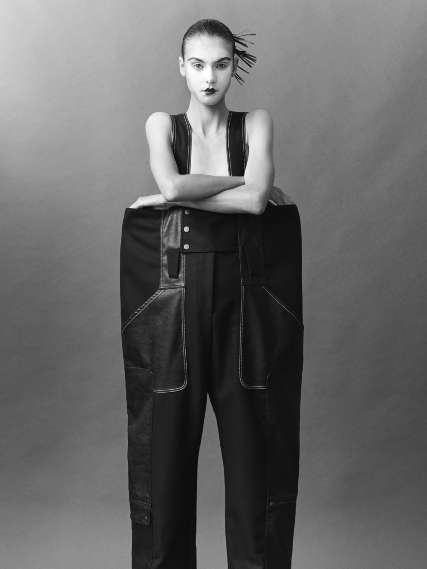 Шерстяной комбинезон со вставками из экокожи, Stella McCartney«Как женщина, которая разрабатывает одежду для женщин, я много думаю о наших желаниях и потребностях. Мне хочется создавать гардероб, который будет удовлетворять любые наши нужды». На бумаге это может казаться скучным, но стоит увидеть любое из шоу Stella McCartney, чтобы убедиться в обратном. Маккартни работает с тонким вкусом и крепким юмором – в ее дебютной коллекции платья были расцвечены задиристыми надписями на кокни – диалекте британских рабочих. Впоследствии дизайнер пришла к золотой формуле, сочетающей утилитарное мужское и соблазнительное женское (мастерство мужского кроя юная Маккартни перенимала в лондонском ателье на Сэвил-роу). Визитная карточка дизайнера – андрогинный микс строгих приталенных жакетов и широких брюк из классической костюмной шерсти под комфортные кроссовки, а также прозрачные кружевные платья, надетые поверх трикотажных водолазок, – смотрится иронично, легко и неизбежно сексуально.