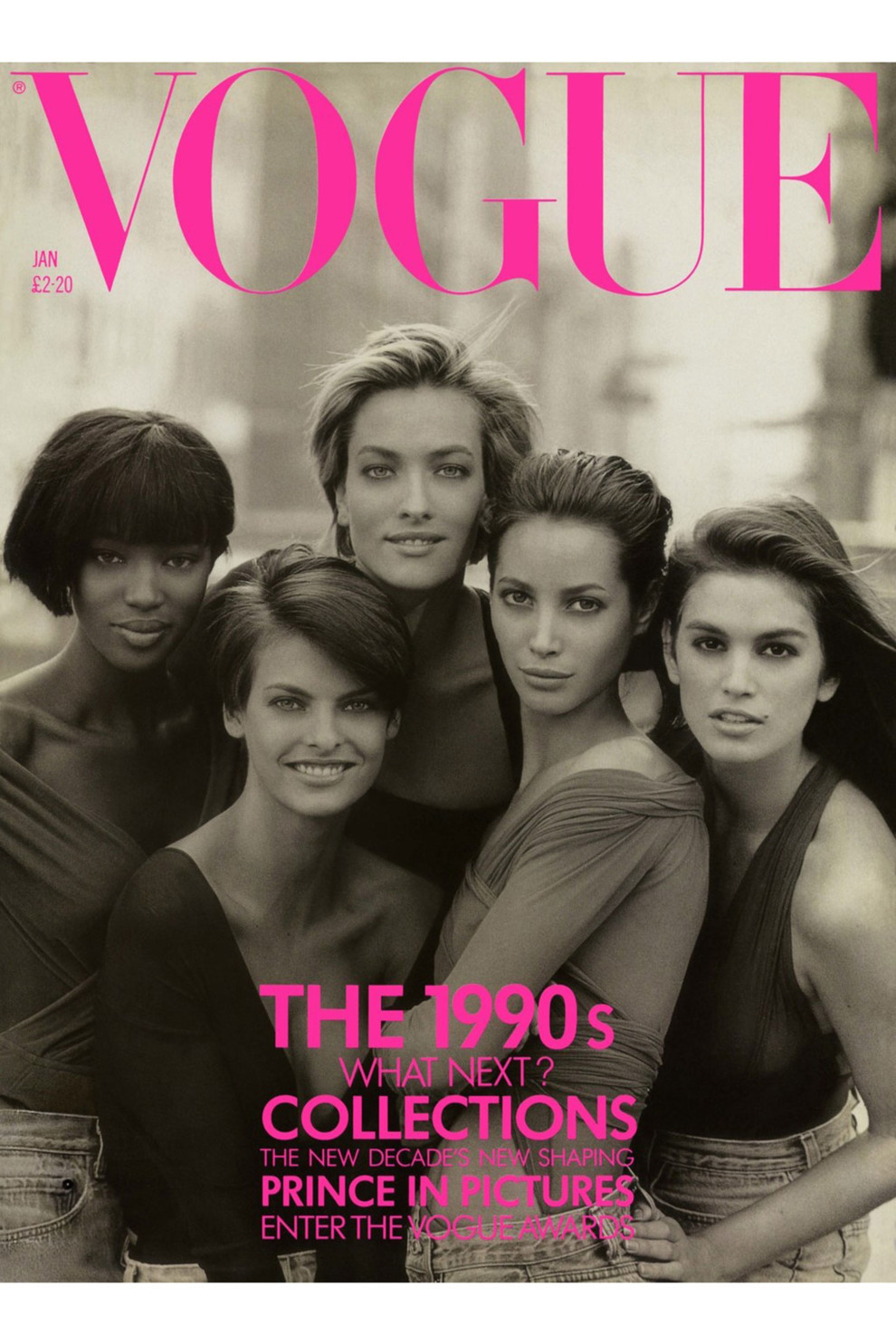 Vogue British, январь 1990Легендарный кадр, после которого к немецкому фотографу Питеру Линдербергу пришла мировая известность, был сделан в 1988-м году. На черно-белом снимке была изображена группа начинающих моделей, позирующих на пляже в белых рубашках, будто снятых с мужского плеча. Затем, в январе 1990 года, вышла обложка для британского Vogue, на которой появились Линда Евангелиста, Татьяна Патитц, Наоми Кэмпбелл, Кристи Тарлингтон и Синди Кроуфорд. Джордж Майкл увидел обложку и после этого пригласил золотой состав супермоделей стать главными героинями его клипа «Freedom! '90». Музыкальное видео в свою очередь вдохновило Джанни Версаче и дизайнер заключил контракт с девушками на участие в его шоу.