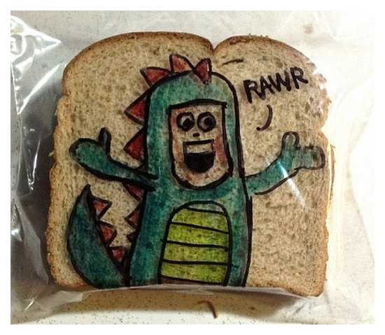 Дэвид Laferriere работает графическим дизайнером. Свои навыки рисования он использовал, чтобы развеселить своих детей. Каждое утро он не только сам делал бутерброды для своих чад в школу на обед, но и с помощью маркеров рисовал на пакетах, в которые заворачивал детский обед, чтобы их как то развеселить. И каждый день рисунок был разный. За 5 лет пока его дети ходят в школу он нарисовал более 1000 рисунков, темы которых варьируются от динозавров и монстров до золотых рыбок и уток. Идеи приходят очень быстро, он их быстро набрасывает на целлофановых пакетах, кладет в сумку пока дети собираются и только в школе они видят что же сегодня нарисовал им отец. Таких обедов нет ни у кого в мире, несмотря на то, что даже если Ваш отец художник ни кому больше в мире не пришла такая идея развеселить своих чад с помощью авторских пакетов.